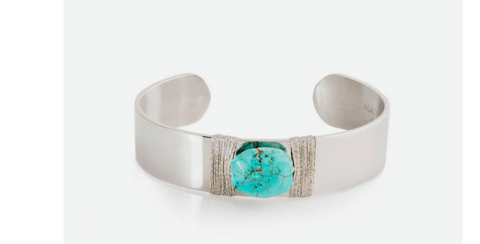 Uno de los diseños más chulos presentes en el catálogo online es esta pulsera rígida, abierta, ajustable, con hilo de acero y turquesa reconstituída. Un diseño totalmente juvenil. Y que queda a la perfección también durante el otoño y el invierno con aquellos jerseys, americanas o camisas de manga tres cuartos.