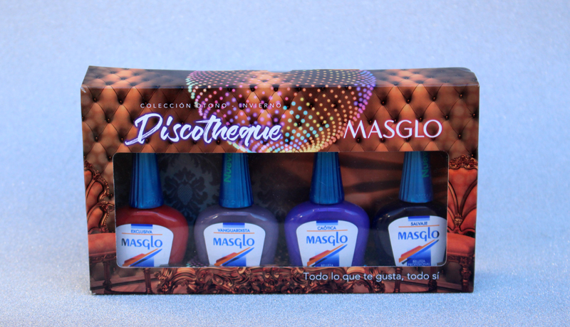 La colección Discotheque de Masglo está inspirada en las grandes corrientes artísticas del Barroco y el ambiente Disco de los años 70 y por ello los tonos son extravagantes, potentes, llamativos. Son estos cuatro: exclusiva, vanguardista, caótica y salvaje.