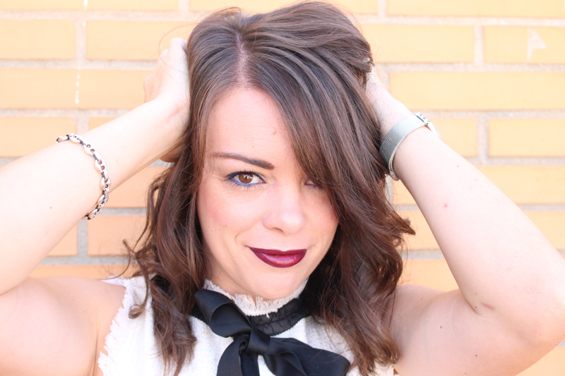 En los labios me puse el tono 09 Misterious (el más oscuro) por todo el labio, luego con el tono 10 Elegance le di unos toques en el centro del labio para darle un punto de luz y volumen al labio y encima le puse el gloss y el resultado fue espectacular (y eso que los labios los tenía bastante secos y con algún pellejito). Me rellené las cejas con el lápiz, y me delineé el ojo arriba y abajo con el lápiz de ojos azul, ¿os gusta el resultado?