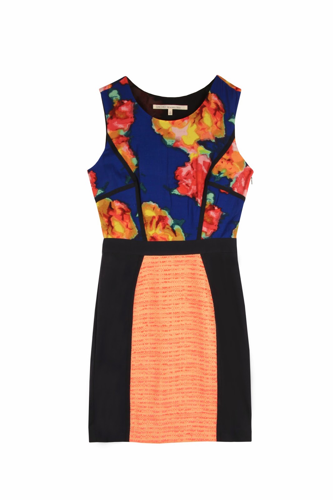 Es un vestido que te hará destacar ya que combina diferentes tipos de estampados y colores que contrastan (el azul que es precisamente el complementario o opuesto del coral) y toques de negro.