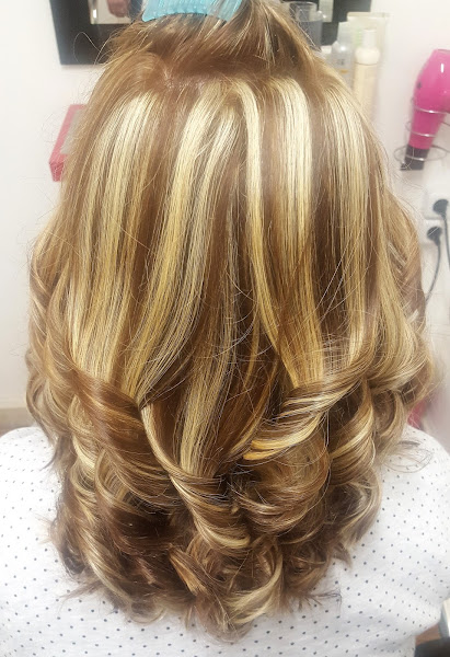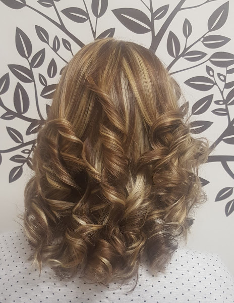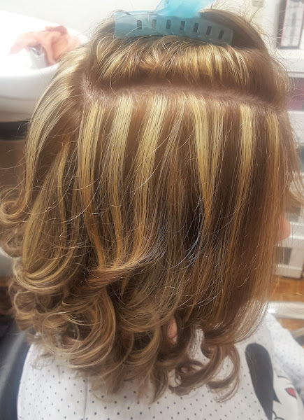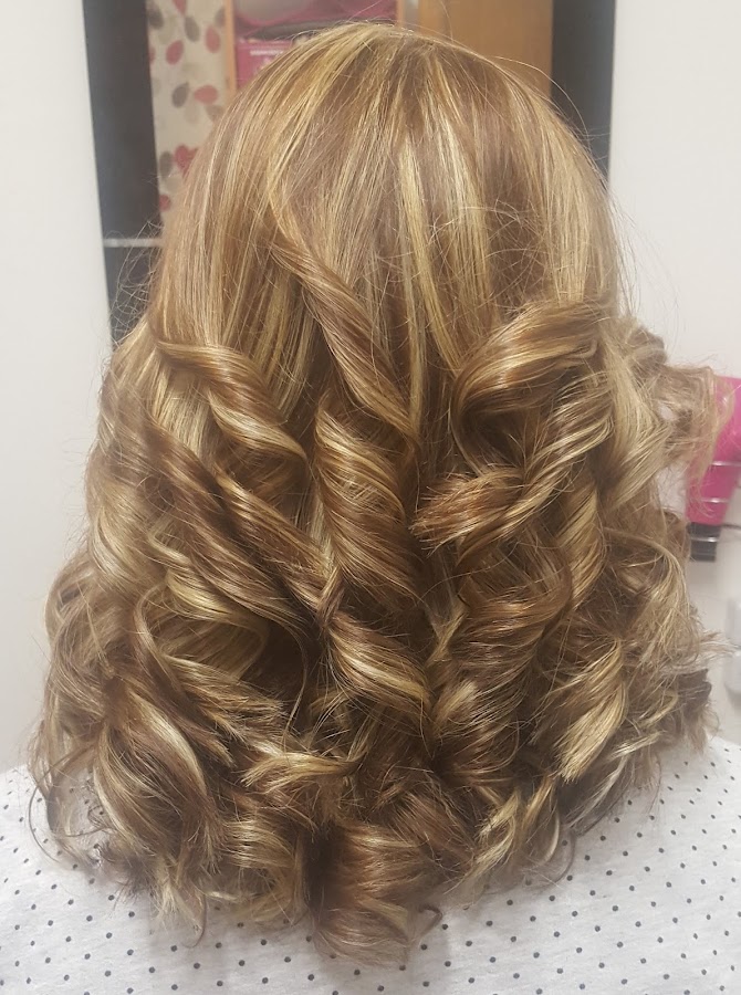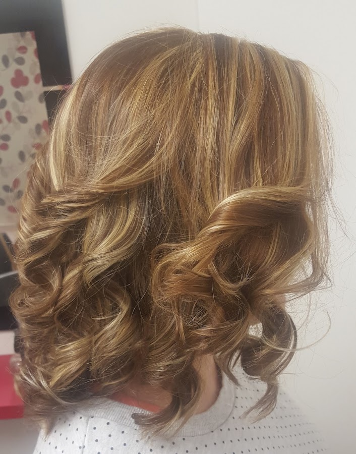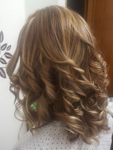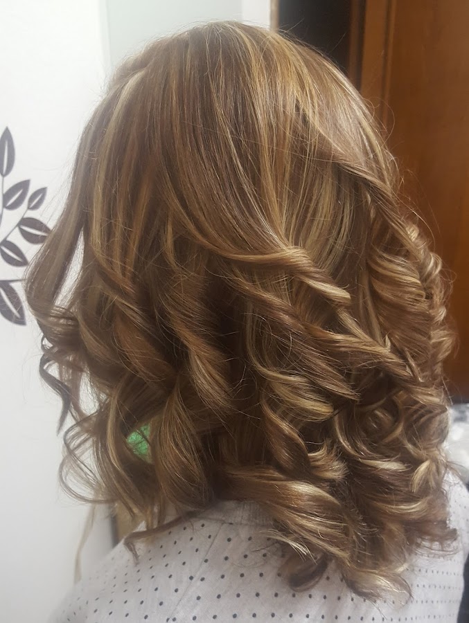 Ella tenía el cabello castaño natural y restos en medios y puntas de unas mechas antiguas, lo que le hice fue hacerle unas mechas con papel de aluminio por toda la cabeza y luego matizar todo el cabello con un baño de color, unos minutos de exposición y aquí os dejo el resultado, secado al aire y le hice tirabuzones con plancha.