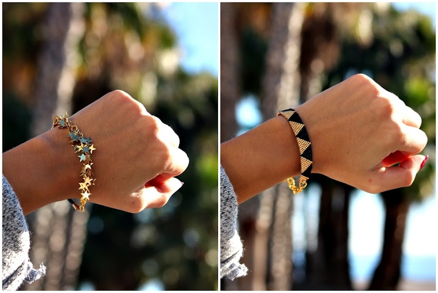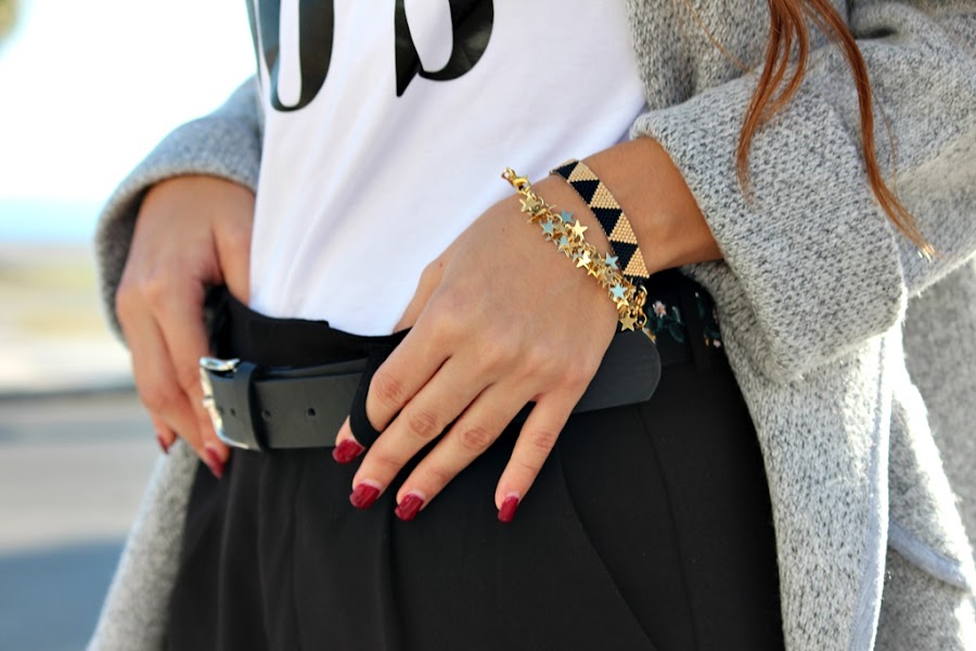 El cinturón bordado lo podréis encontrar en Stradivarius y aunque no se ve a simple vista llevo dos pulseras súper bonitas. Una es con estrellas doradas y la otra, mitad negra y dorada. (Más abajo podréis ver las fotos de cerca).