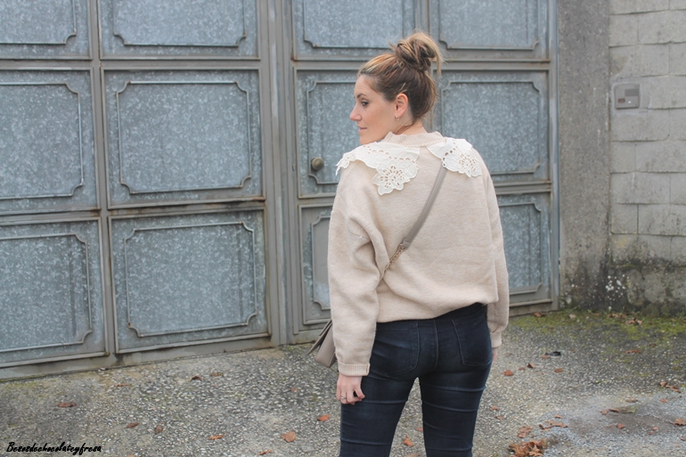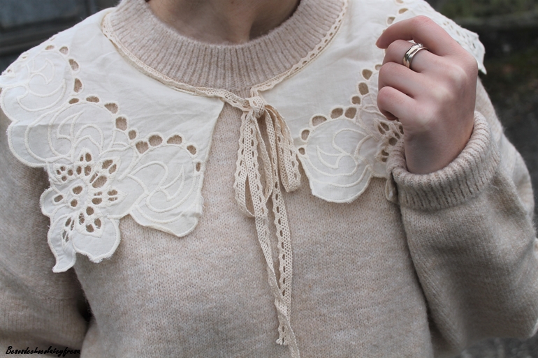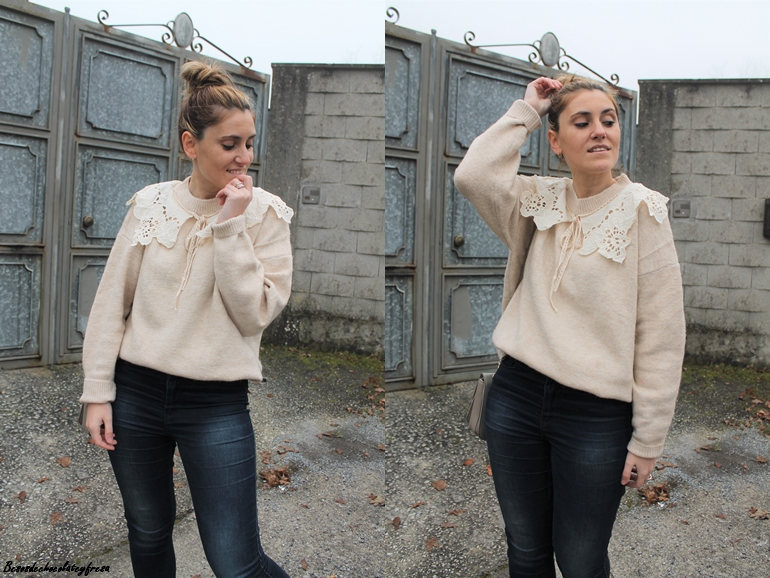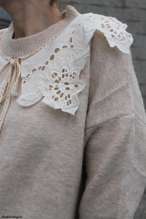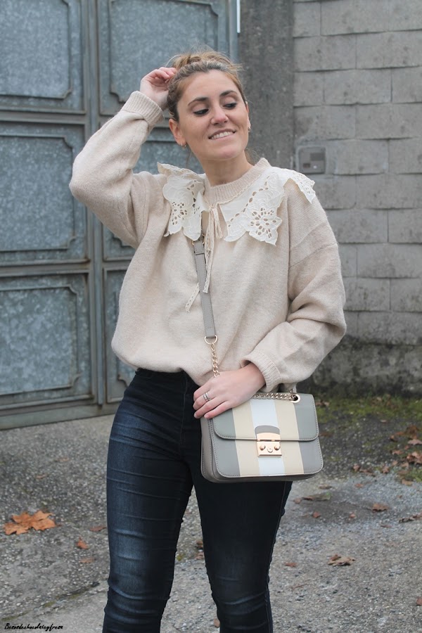 En el look de hoy os muestro dos prendas con tonos neutros/tierra tanto en beige del sweater oversize, amoroso y gordito para días muy fríos con detalle de puntilla a modo de cuello bebe que lo hacen diferente y original a la vez, y en tonos marrones, las botas Ugg, un clásico/básico que no defrauda invierno tras invierno y con el que no pasaremos nada de frio.