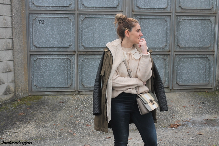 Completo el look con jeans oscuros y bolso en las mismas tonalidades y por encima parka en color kaki.