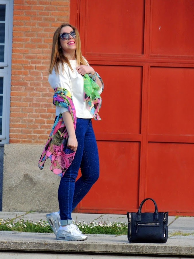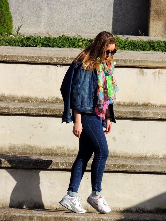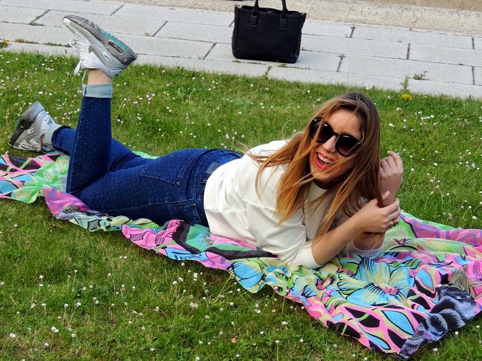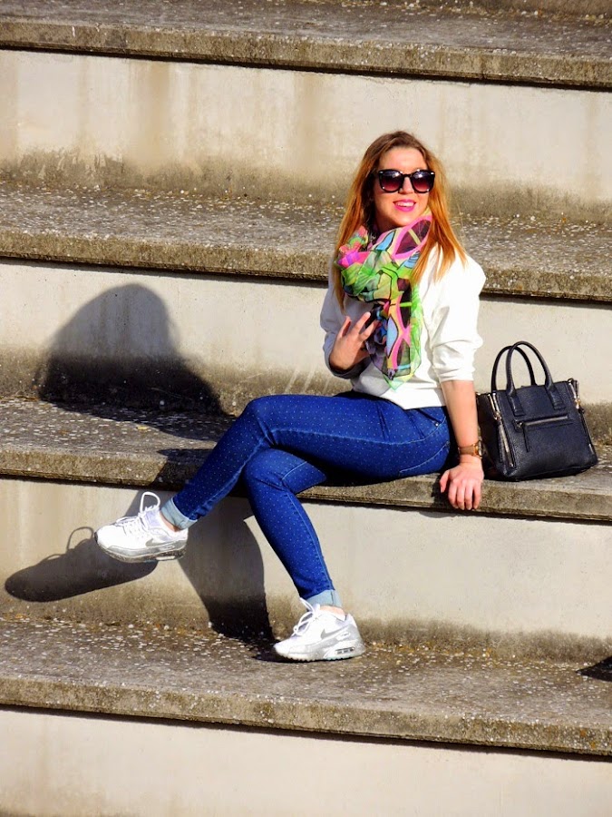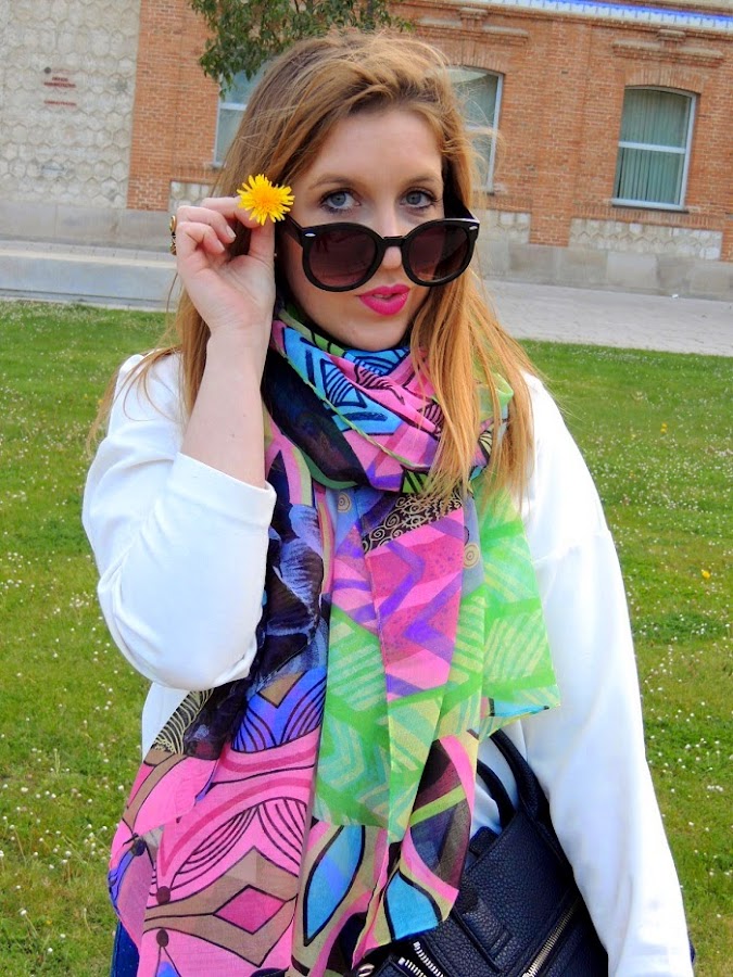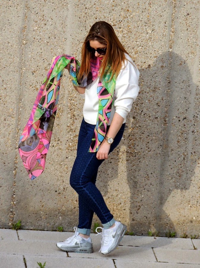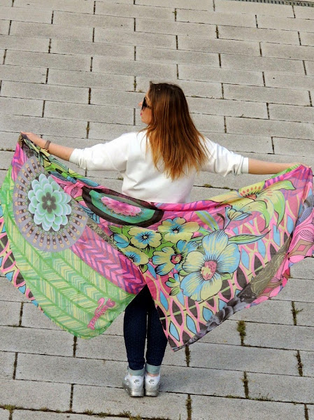 Hace unos meses me regalaron este precioso pañuelo estampado de Desigual. En cuanto lo vi sabía que iba a sacarle mucho parotido con prendas básicas de cara al buen tiempo. Hace unos días lo estrené con la combinación jeans + sudadera blanca + zapatillas. Un look básico que se vuelve divertido con los toques alegres y colores flúor del pañuelo. Con el que me lo pasé pipa probando distintas maneras de llevarlo. ¿Habéis pensado cuánto da de si un simple pañuelo? A veces solo nos quedamos con lo simple o más conocido y no pensamos en las múltiples posibilidades que nos ofrecen muchas prendas de nuestra colección. Os animo a reinventar todas esas prendas que tenemos estancadas en el fondo del armario y darles una segunda oportunidad. Usar la imaginación y dejaros llevar :)