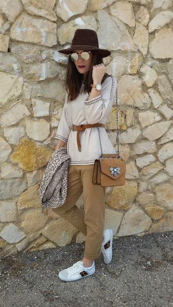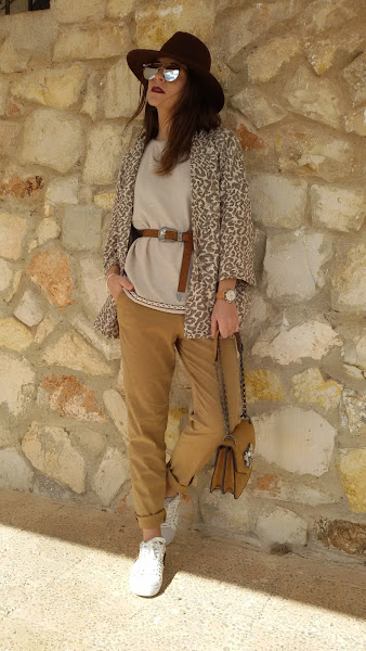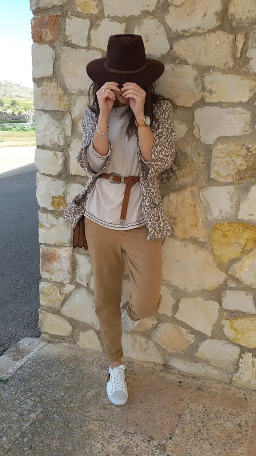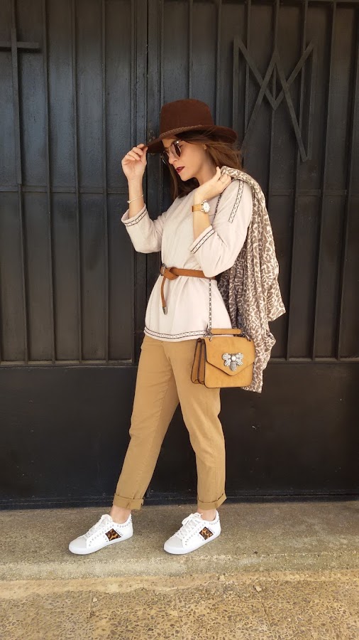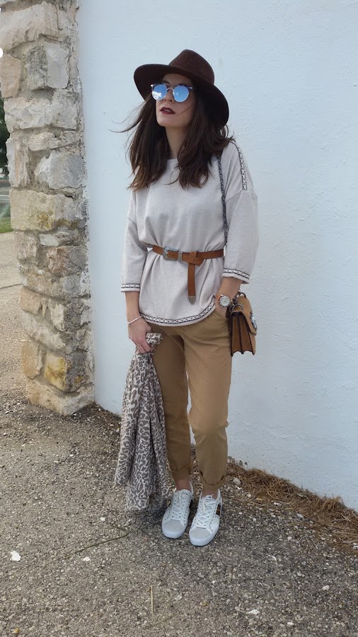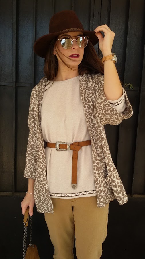 Por último y como complementos ; bolso de Parfois , sombrero en color marrón chocolate , cínturón camel con hebilla , reloj de Lotus y gafas de rebajas de Stradivarius .