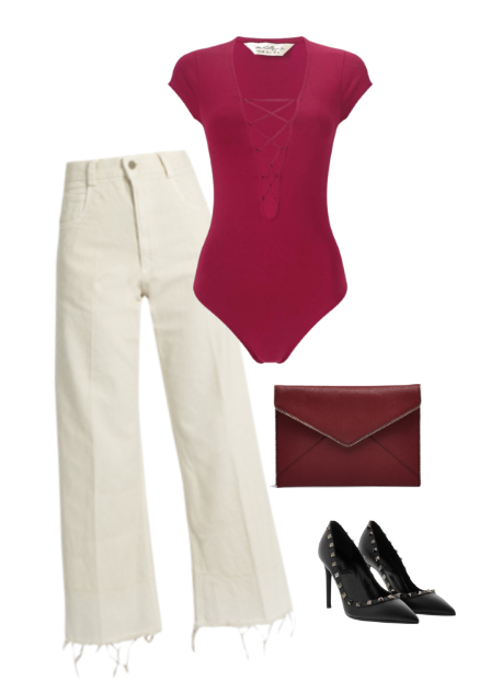 Por último un look más arriesgado, con un body rojo con escote con lazada en color borgoña, vaquero de pernera ancha, salones con tachuelas y bolso de mano también en borgoña.