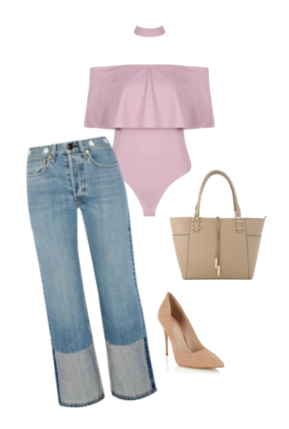 Este otro look se compone de body con hombros al descubierto, vaquero de tiro alto y pernera ancha y salones y bolso tote, ambos en color nude.