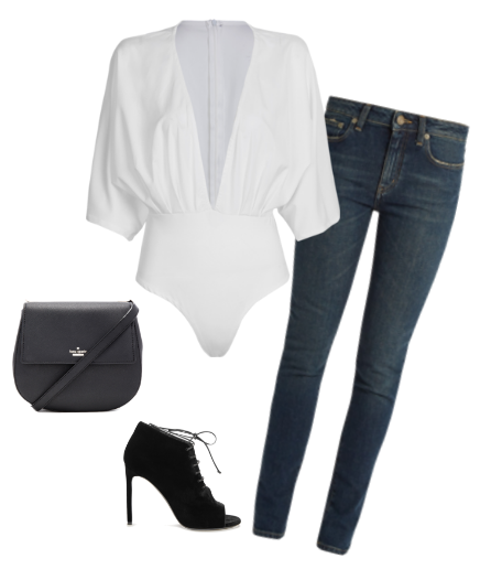 Este conjunto reúne un body blanco con jeans skinny oscuros, rematan el look un bolso bandolera pequeño y botines peep-toe.