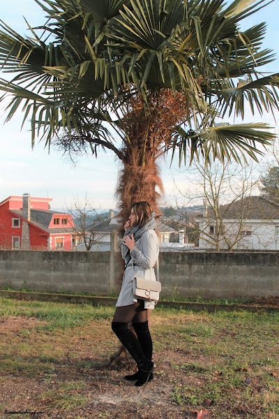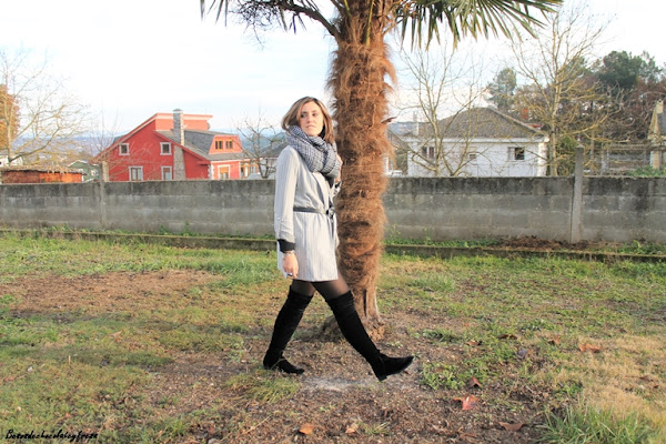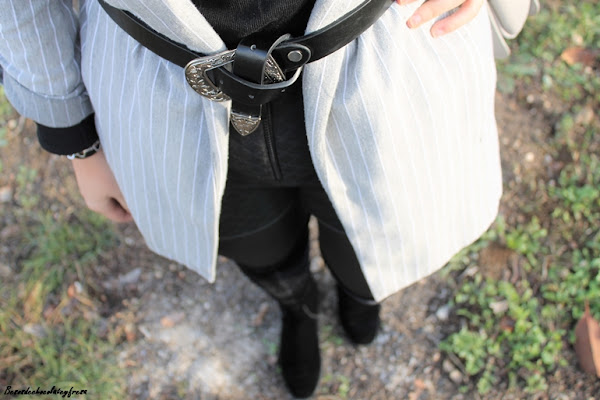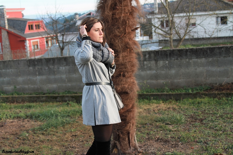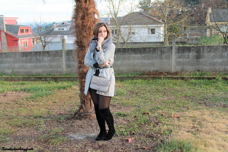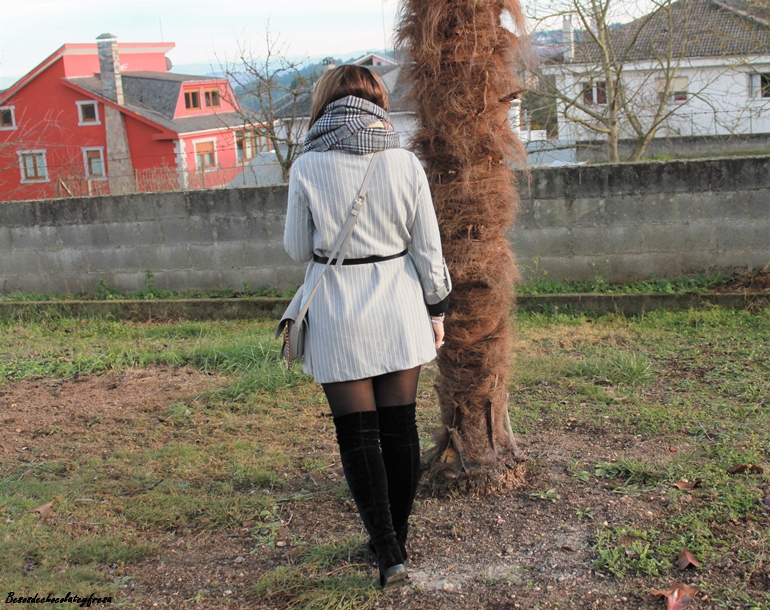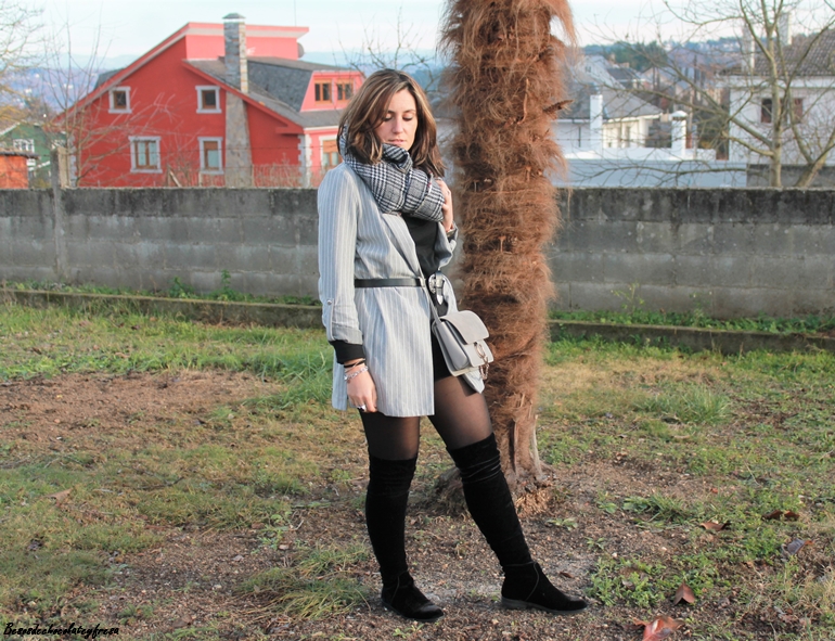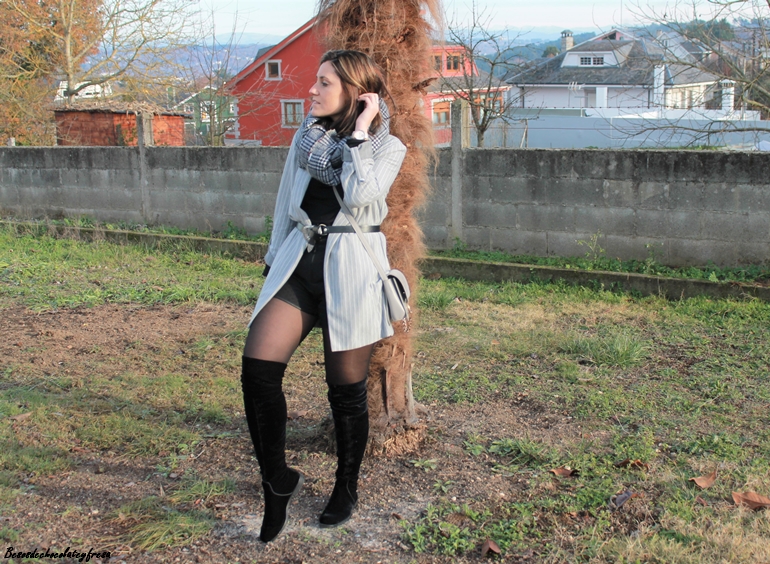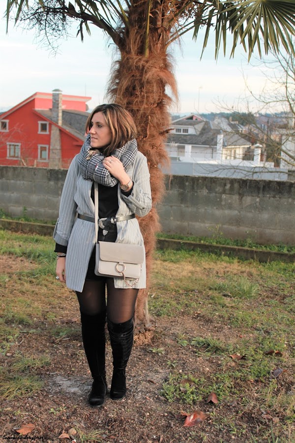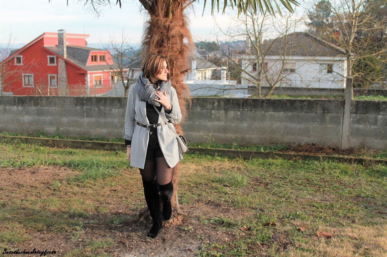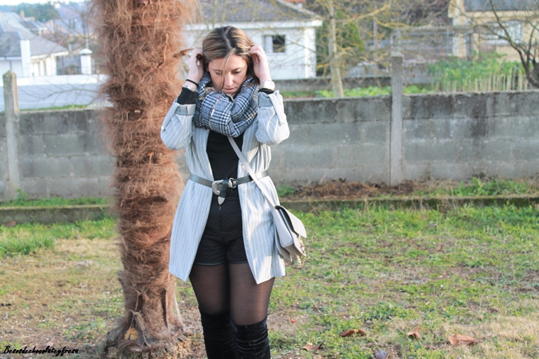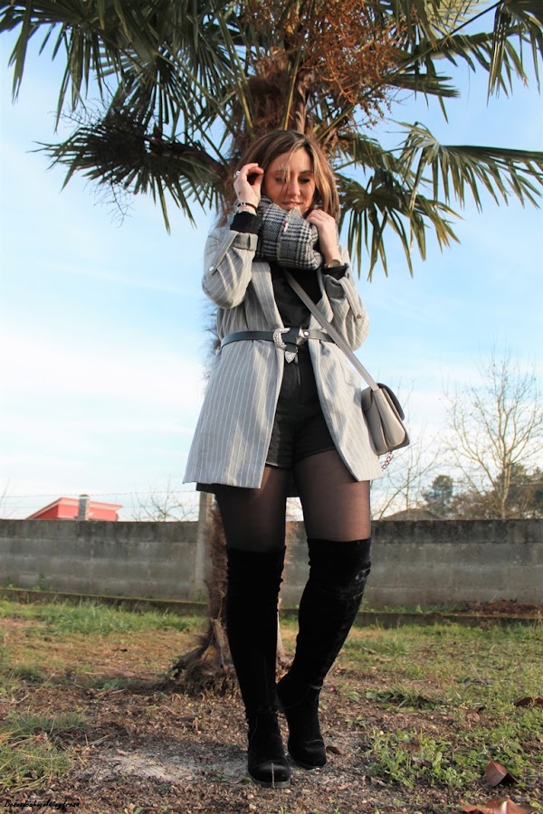 Para la ocasión llevo shorts negros con mis queridas y nuevas botas de terciopelo negro efecto media por encima de la rodilla. Por encima decidí llevar un sweater de cuello cisne en negro, blazer oversize de rayas y en gris con el cinturón para marcar cintura. Maxi-fudanda en los mis tonos con estampado pata de gallo al cuello, pues el frío de estos días es mucho.