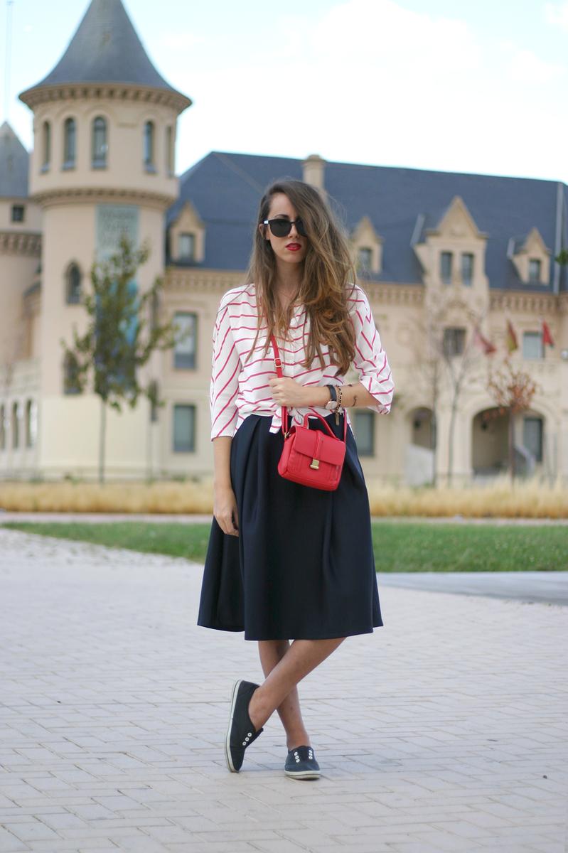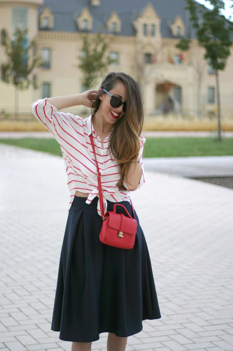 I recently got this shirt with red stripes, after considering several possibilities to make an outfit with it I decided to combine it with my midi skirt ever so comfortable but this time I wanted to give it a different feel by adding sneakers to look. Red lips were essential with this outfit. I knotted shirt, instead of putting it inside.