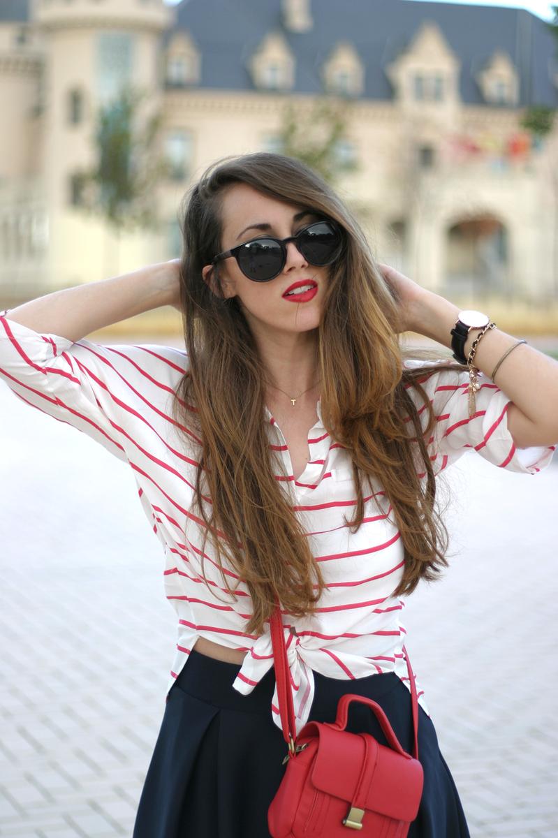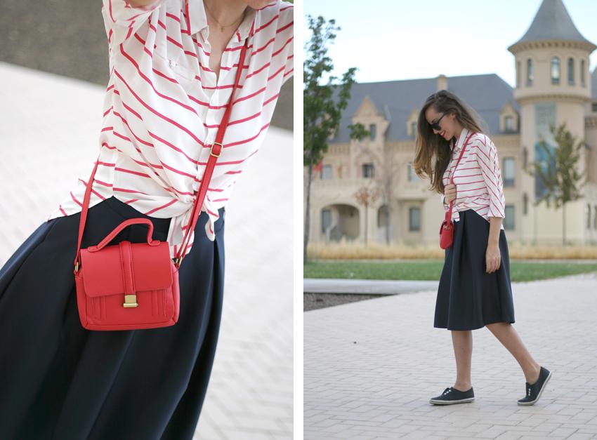Hace poco me llegó esta camisa de rayas rojas, tras barajar varias posibilidades para hacer un outfit con ella decidí combinarla con mi falda midi siempre tan cómoda pero esta vez quería darle un aire distinto añadiendo sneakers al look. Los labios rojos eran indispensables con este outfit. Como detalle anudé la camisa en vez de meterla por dentro.