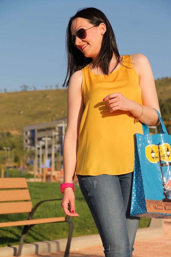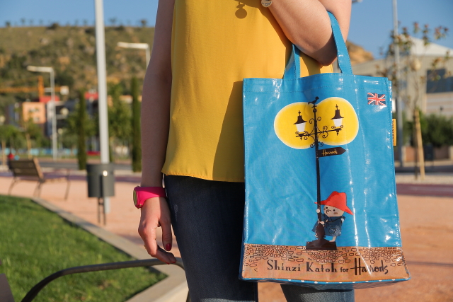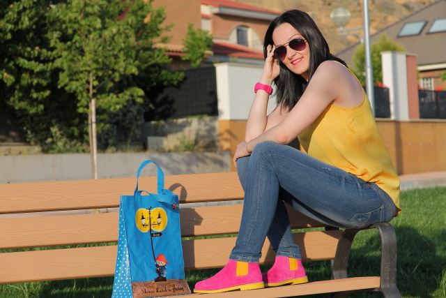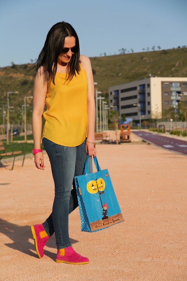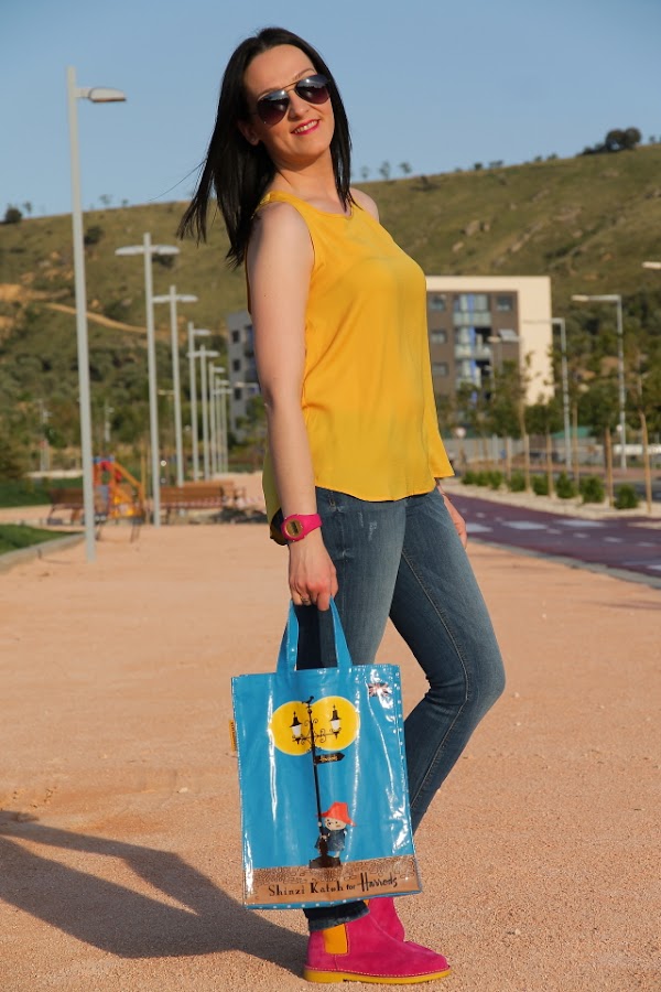 Hay días que las sesiones de fotos son de lo más divertidas, este día me lo pasé genial como podéis ver en mi cara. El estilismo que llevaba con jeans pitillo y top amarillo me permitió hacer un sin fin de tonterías que nos hicieron reír sin parar. El calzado también jugó un papel importante, cuando llevo estos botines estilo Neon Boots voy tan cómoda que ni los noto. Este invierno ya os los enseñé aquí en azul y rojo y tenía pendiente mostraros los que llevo hoy con la combinación fucsia y amarillo. Pero lo que más me gusta de este outfit es la famosa bolsa de Harrods con el dibujo del conocido Oso Paddington, desde aquí les agradezco a Silvia y Alejandro que me la trajeran de Londres.