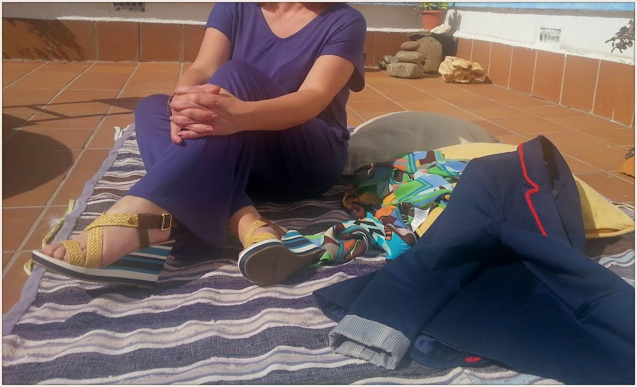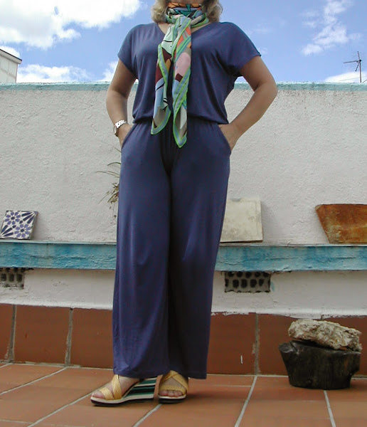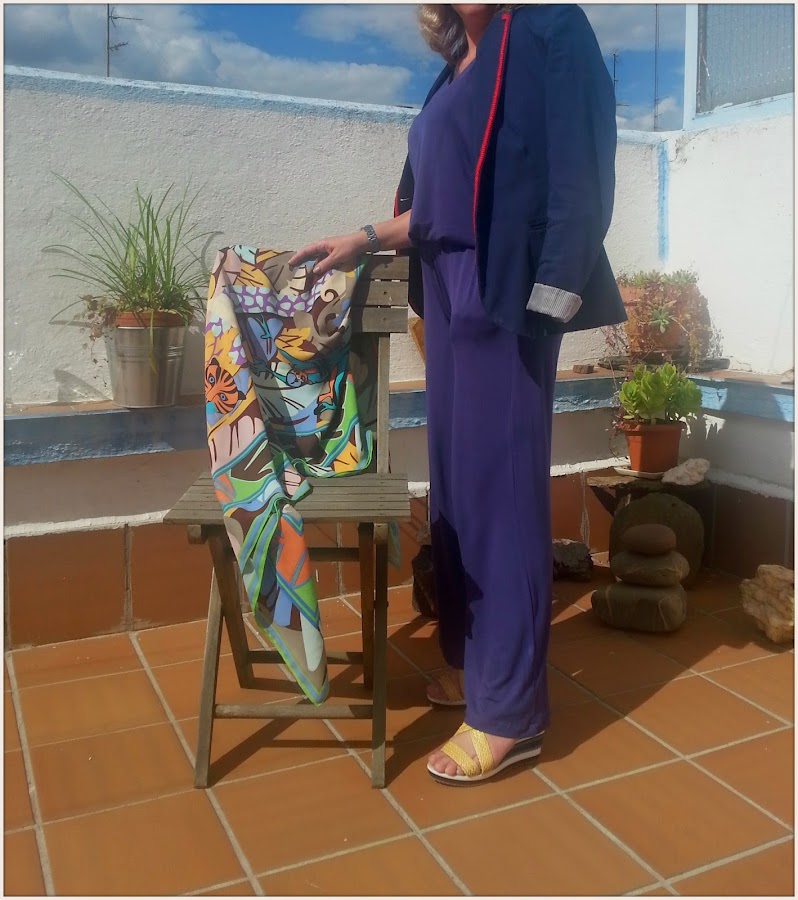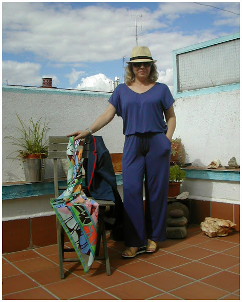Hoy os presento un look que podríamos encasillarlo en ?comida con amigos?. Un mono largo en tono azul con mucha caída, con sandalias de cuña, como adorno un pañuelo de colores llamativos y un sombrero de paja, de estilo borsalino, muy acorde para una comida en una terraza con sabor mediterráneo.