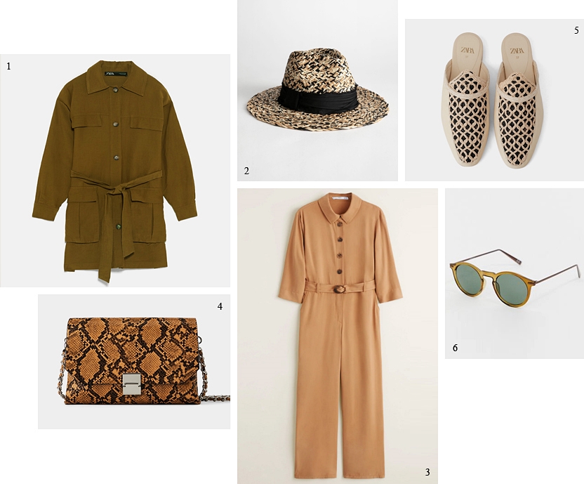 En orden: Cazadora caqui, Zara (49.95€) Fedora de mimbre, & Other Stories (35.00€) Mono marrón, Mango (49.99€) Bolso pitón, Zara (15.99€) Babuchas, Zara (79.95€) Gafas de sol, ASOS Design (15.99€)