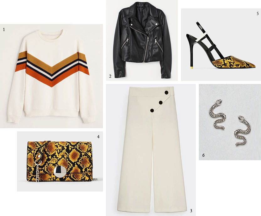 En orden: Sudadera paneles, Mango (29.99€) Cazadora biker, H&M (39.99€) Pantalón palazzo, Uterqüe (89.00€) Bolso pitón, Zara (19.95€) Zapato destalonado de pitón, Zara (25.95€) Pendientes serpiente, Kingsley Ryan (08.49€)
