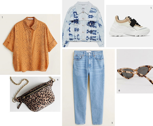 En orden: Camisa leopardo, Mango (22.99€) Cazadora vaquera tie dye, Zara (29.95€) Vaqueros rectos, Mango (29.99€) Riñonera leopardo, & Other Stories (69.00€) Deportivas, Zara (49.95€) Gafas de sol leopardo, ASOS Design (12.99€)