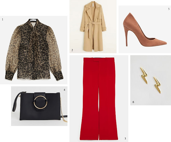 En orden: Blusa print leopardo, Zara (39.95€) Gabardina camel, Mango (59.99€) Pantalones campana, Zara (39.95€) Bolso con anilla, New Look (16.99€) Pendientes rato, Kingsley Ryan (08.49€)
