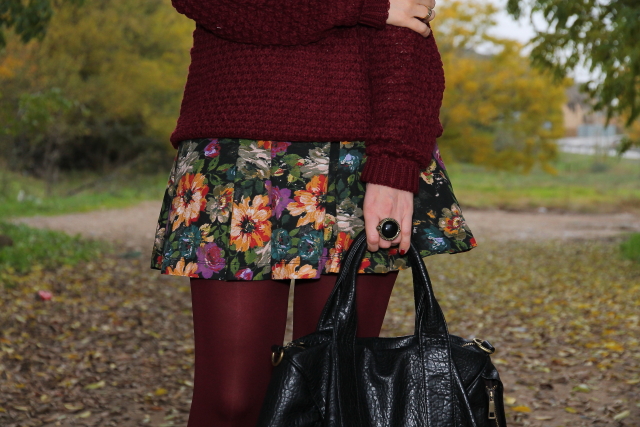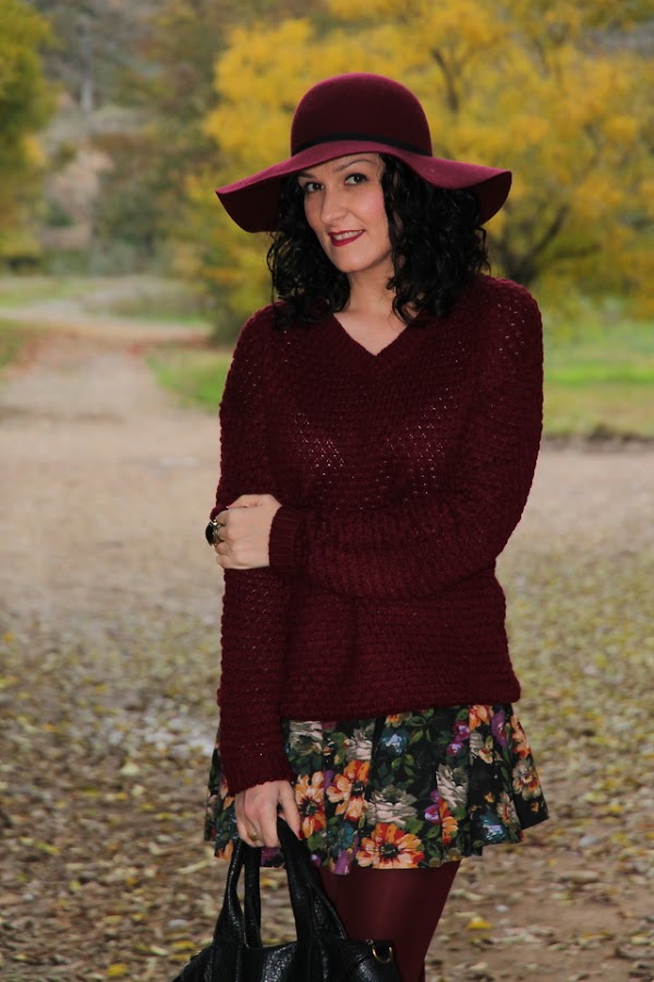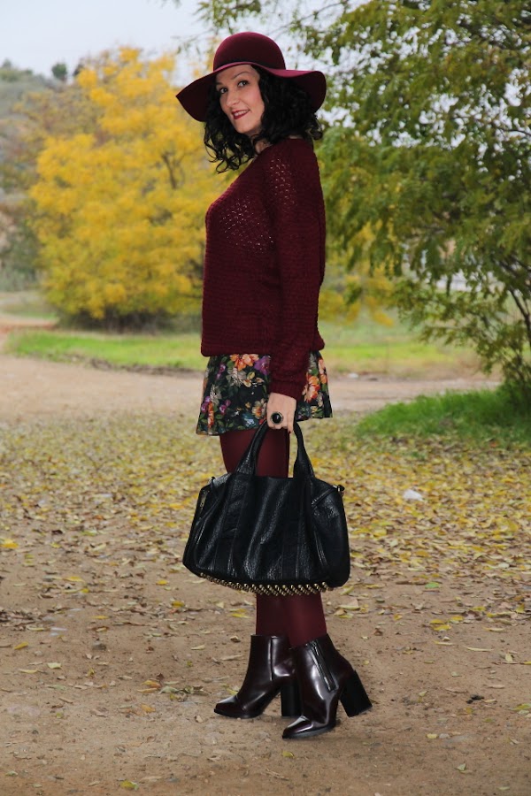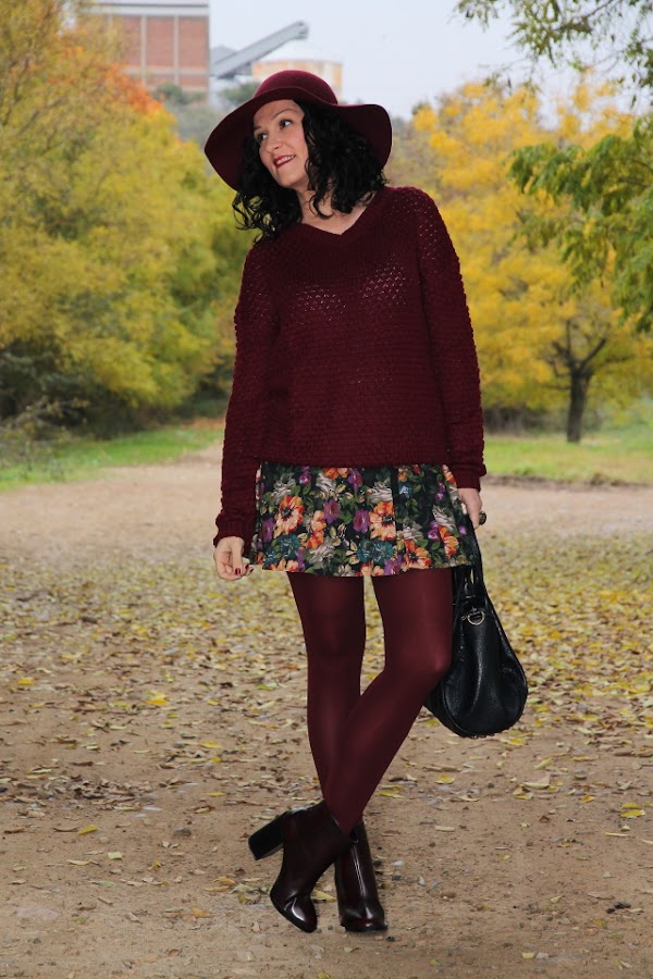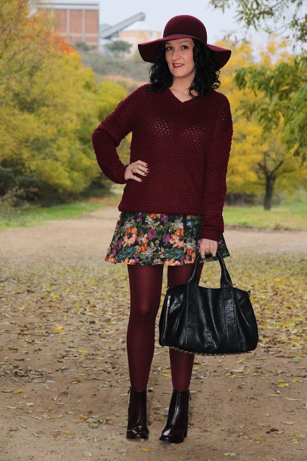 Vuelta al lunes, no se a vosotros pero a mi los fines de semana se me pasan volando. Pero bueno es lo que toca así que no me lío más y os dejo con el look de hoy. Llevo un outfit en el que el claro protagonista es el color del año, el Marsala. He combinado un jersey de punto que me resulta ideal para no pasar frío, ya sabéis que soy muy friolera, y falda de flores para romper el total look granate. El resto del look compuesto por botines granates híper cómodos, sombrero fedora y uno de mis bolsos favoritos.