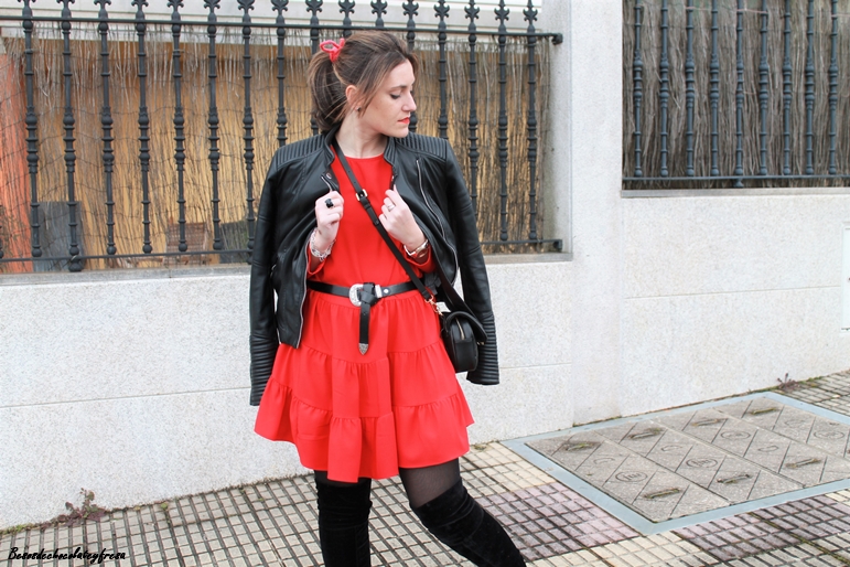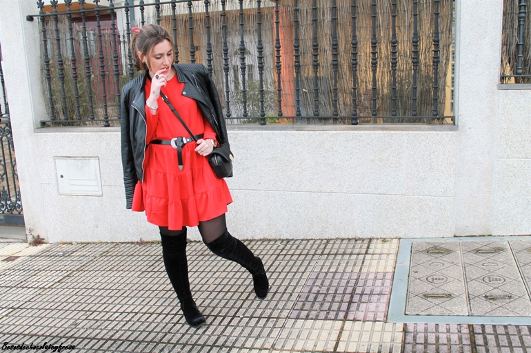 Para esta ocasión aposté por un vestido totalmente rojo con vuelo en la falda a modo de volantes. Un vestido sencillo pero con toques divertidos y sobre todo cómodo. Aposté por combinarlo con negro como las botas, biker y bolso bandolera.