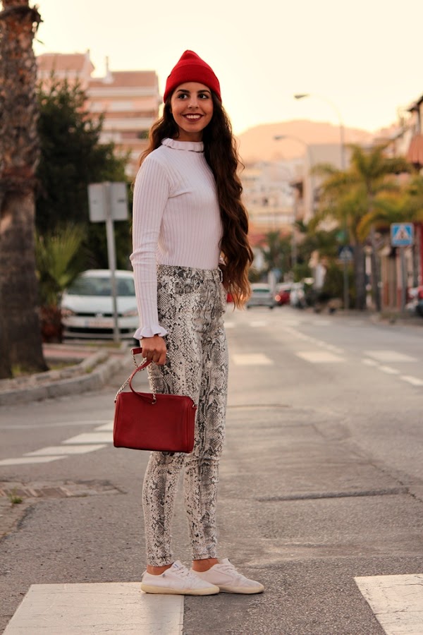 3. El color rojo. Es un punto muy importante para no conseguir el típico outfit plano, sin ese "Punch". Siempre lo utilizo en los looks con estampados porque le da mucho rollo y un toque diferente al conjunto. Aunque sea un tono muy fuerte, conseguimos que nuestra prenda tenga protagonismo. Es el caso del último outfit, como veis, llevo un total white que nunca falla, es un acierto seguro con este estampado, igual que el negro, pero para que no fuese "muy simple" elegí el gorro y el bolso en color rojo.
