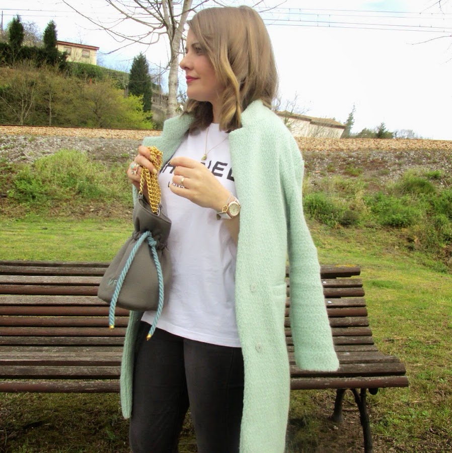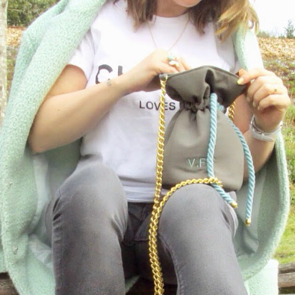 Un jean y una camiseta básica de algodón cambian totalmente con el color del abrigo y los complementos adecuados. En este caso tengo que hablaros de la mini bombonera personalizada de Oh" Cholet que una vez mas me ha enamorado. Esta vez me decidí por el gris y el verde agua y mis iniciales bordadas.
