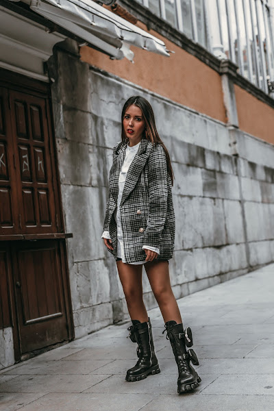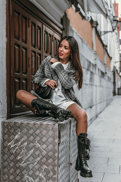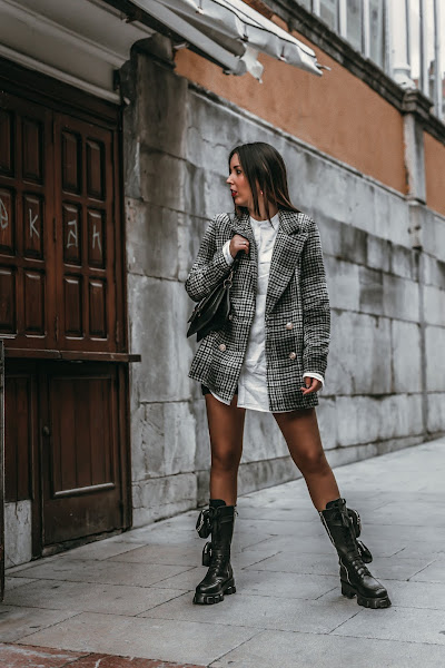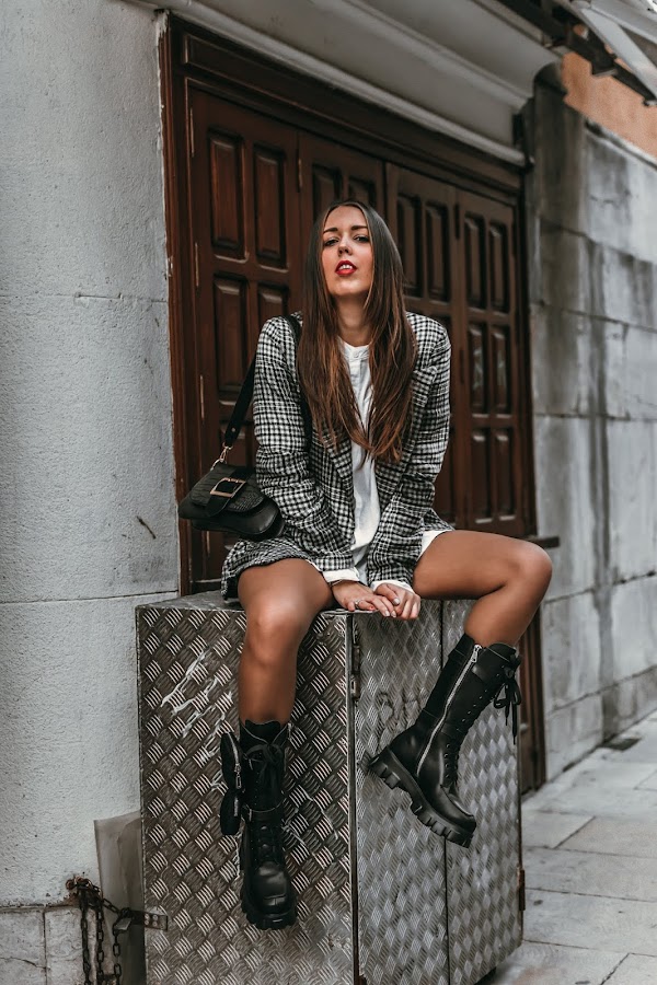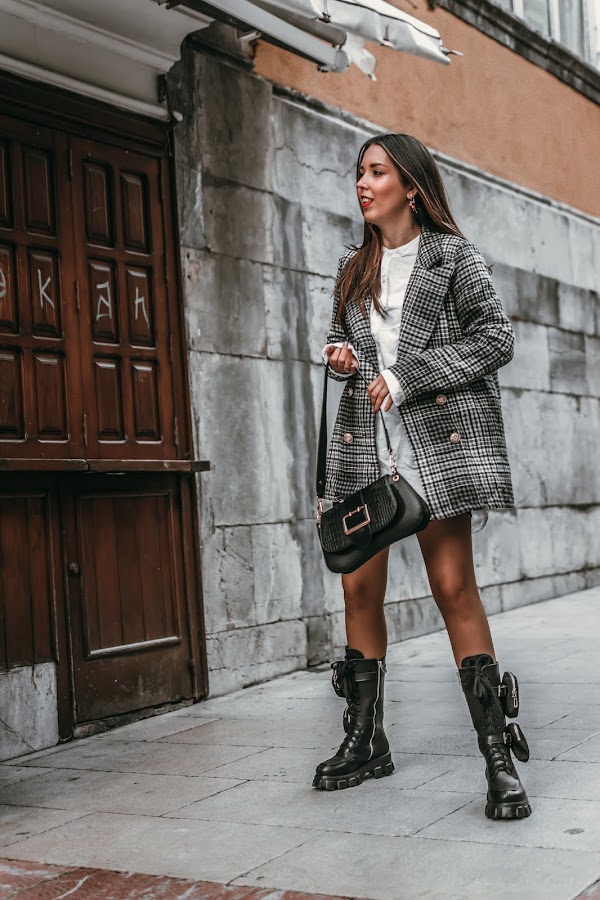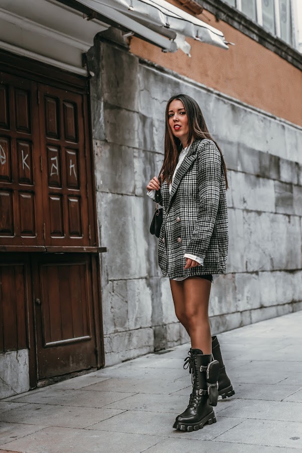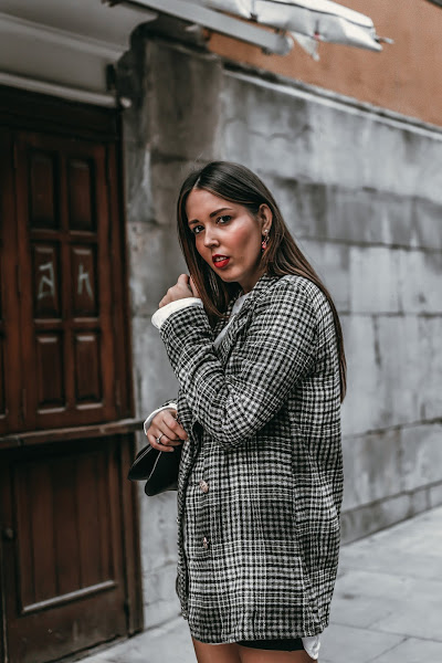 Un look sencillo y que seguro tenéis para poder recrear, busca una americana de cuadros. Esta es de SHEIN, la escogí en colores bastante básicos para darle un toque elegante al look, los cuadros me encantan y le dan ese toque chic y no tan cañero. Para el interior, una camisa blanca oversize básica. Si no tenéis ninguna de esa forma, podéis hacer como yo y robarla del armario de vuestro chico/padre/marido. Conseguiréis ese efecto ancho, además de actual. Para terminar un bolsito negro con pequeños detalles y eso si, si quieres ir más segura, puedes agregar una falda de cuero debajo, un short o unas mallas de ciclista, como yo he hecho.