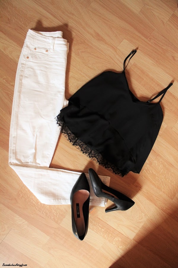 Con negro: Sin duda dos colores que se atraen mucho son el blanco y el negro. Podemos llevarlos con una camiseta negra y zapatos de uno de los dos tonos para tener un look perfecto.Hello!! What week?