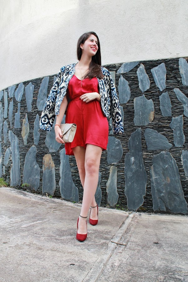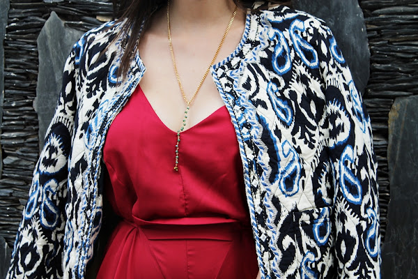 La mezcla de colores y texturas son de mis cosas favoritas a la hora de armar un look; al tratarse de una salida romántica decidí usar este romper color vino que es de mis favoritos, luce precioso y como ya saben amo como luce el color vino en contraste con mi color de piel, lo combine con zapatos del mismo color y para dar ese toque de originalidad al look mi nueva chaqueta en tonos azules, negros y crema era ideal y me abrigaba del frío de la noche.
