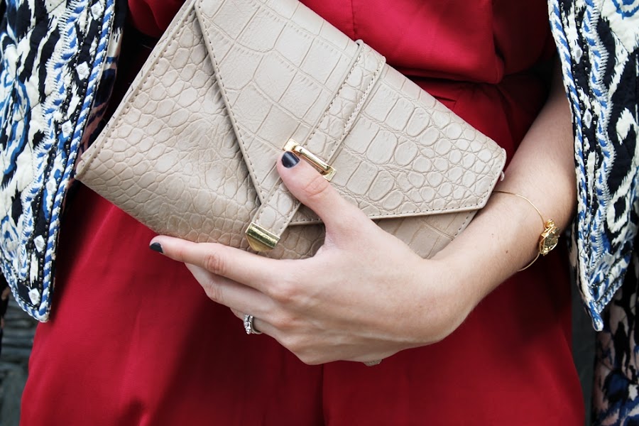 Decidí usar accesorios en tonos dorados para aportar el toque de elegancia que siempre es tan necesario, el collar tiene verde así que da un lindo contraste, una pulsera dorada y el sobre con detalles crema y dorado eran perfectos para completar todo.