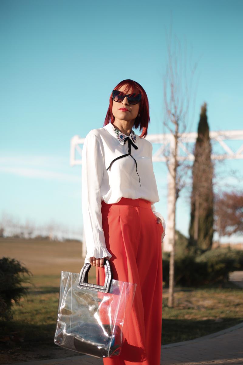 La combinación es sencilla como podéis ver, simplemente opte por una blusa blanca, con toque de pierdas joya y una lazada en el cuello que le da ese toque más chic y femenino, un bolso de vinilo que ya os lo enseñe en mi Instagram y que es tendencia total esta temporada y ¡listo!… así de fácil