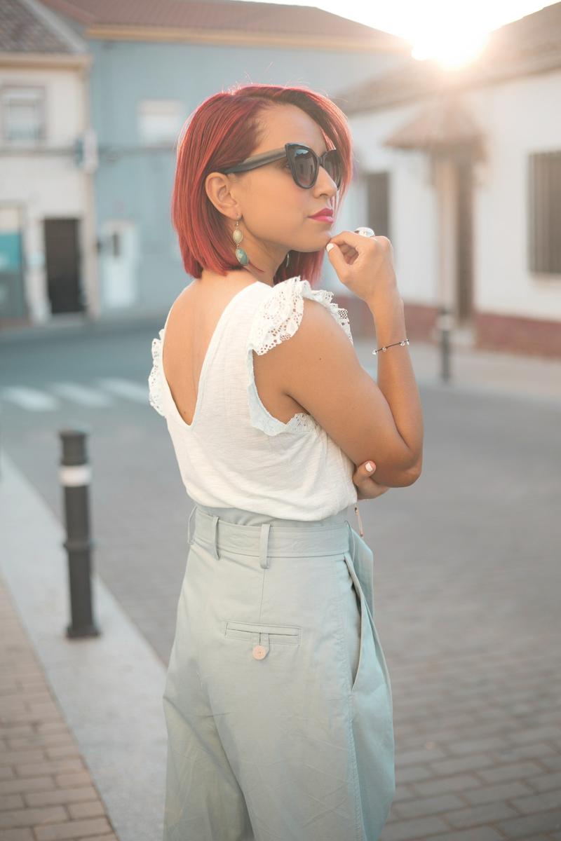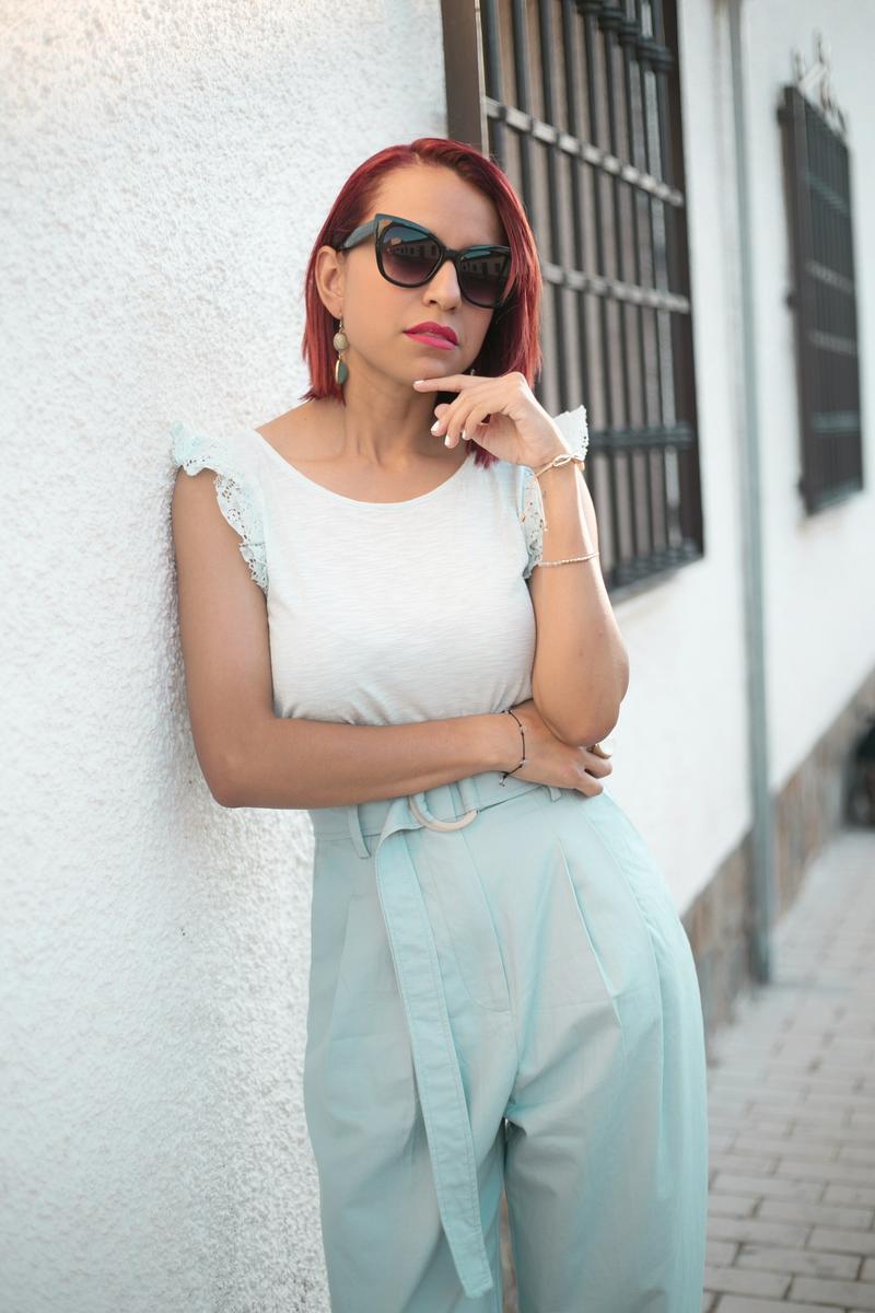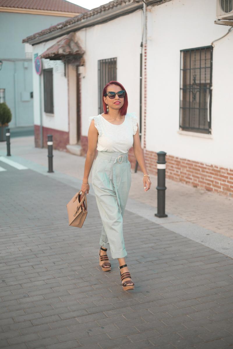 Hay de varias formas y estilos, pero eso sí siempre con la misma característica, cintura alta y fruncida. En mi caso, el pantalón que llevo va acompañado con un cinturón que es perfecto para darle ese toque “paper bag” . Opte por un look monocromático para alargar más mi figura y unos zapatos con un buen tacón para lucir más el pantalón.