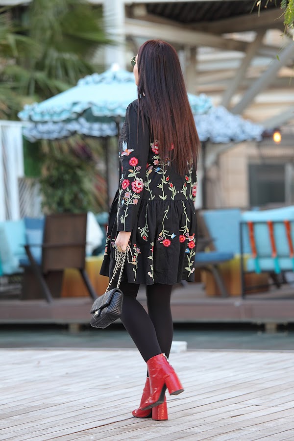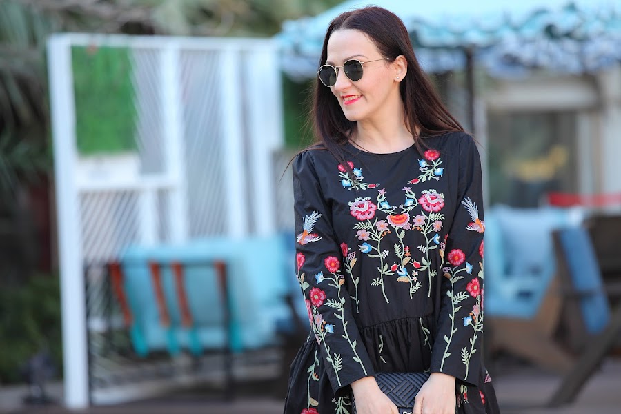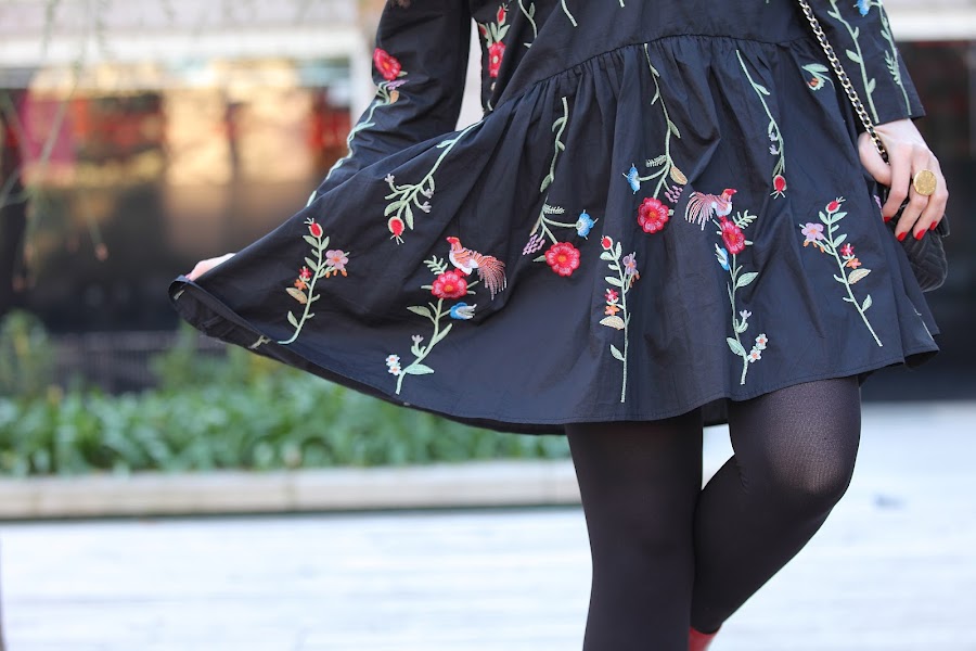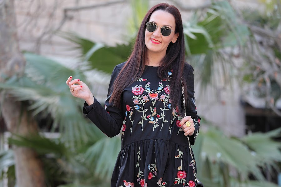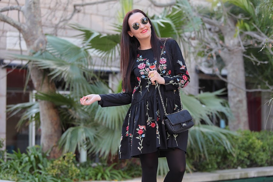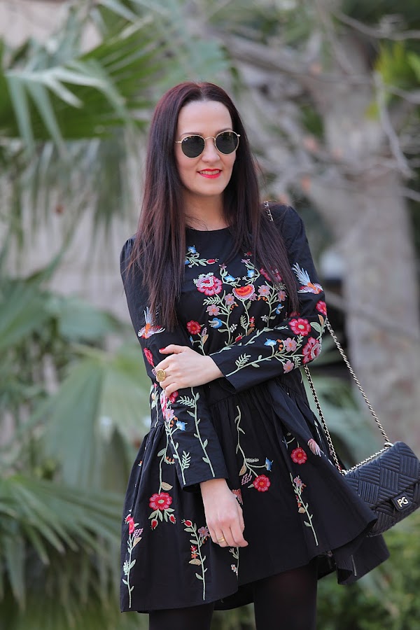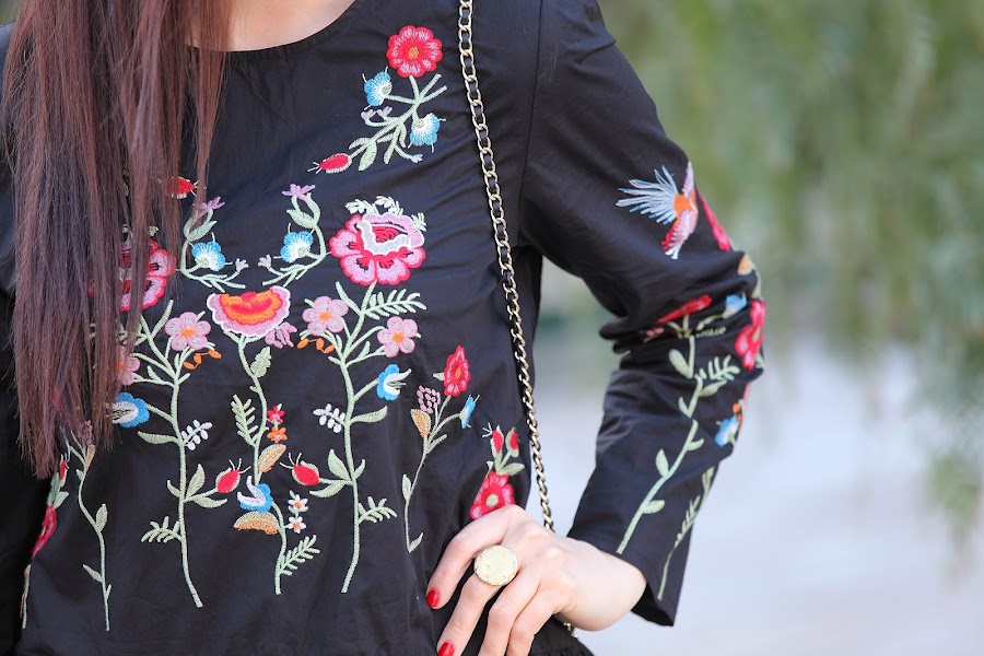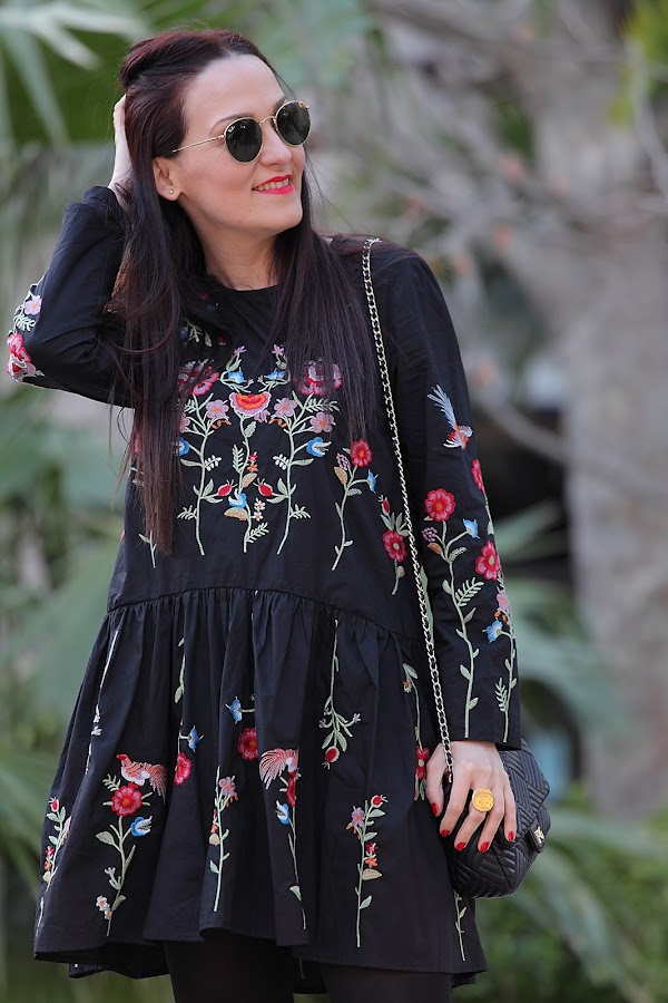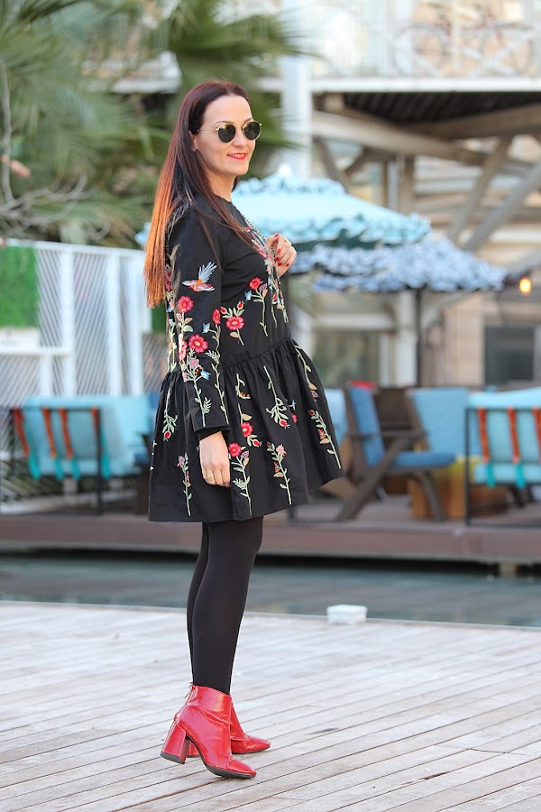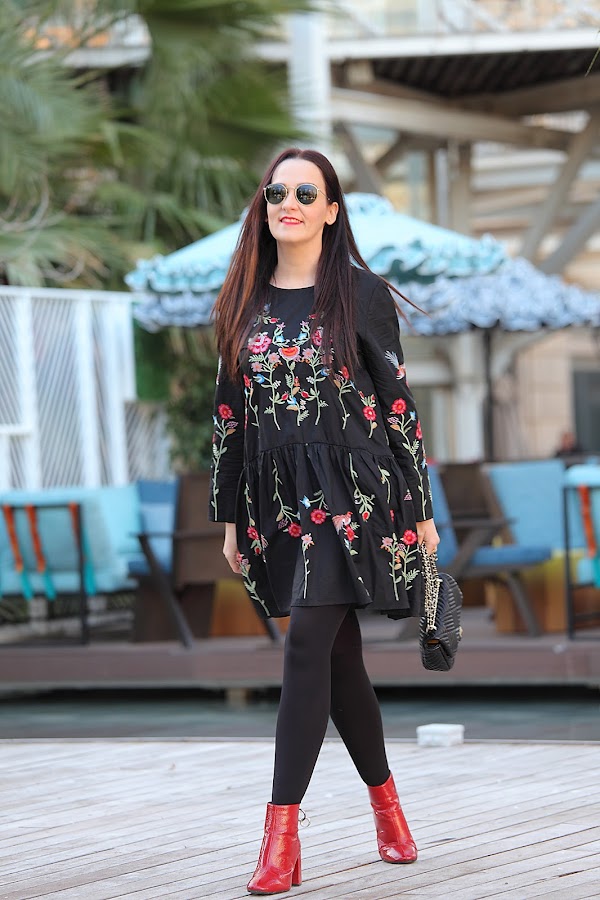 Tengo que admitir que la tendencia de las prendas bordadas me ha cautivado completamente. En posts anteriores os he ido mostrando looks con prendas bordadas ya sean jerséis, camisas, vestidos... y lo que queda, porque esta primavera se que más prendas entraran en mi armario. Mi última adquisición este precioso vestido negro de corte oversize con bordado de floresque he combinado con botines rojos y bolso negro.