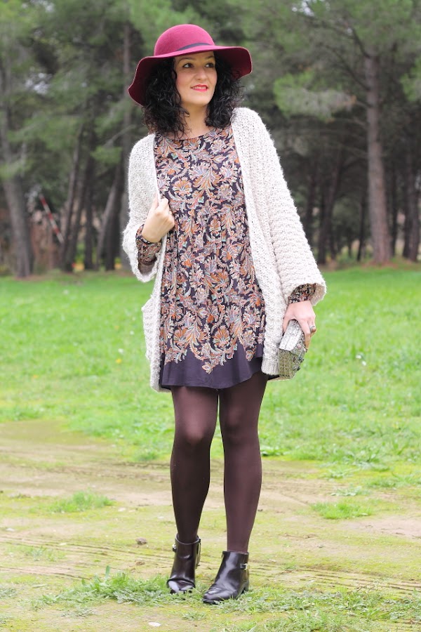 Los vestidos como el que llevo hoy me encantan, tienen un corte que los hace comodísimos y muy favorecedores en todos los cuerpos porque no marcan nada. Esta temporada Zara ha sacado unos cuantos de ellos y con lo que me gustan he aprovechado para comprarlos. Hoy llevo uno en tonos marrones con un estampado de flores precioso. Lo he acompañado de esta fantástica chaqueta de punto gordo y corte kimono que ya me habéis visto en negro aquí y aquí. Para los complementos me he decidido por un fedora granate y bolso metálico. Los botines burdeos me gusta mucho como quedan y además son geniales porque con el taconcito que tienen puedes andar y andar sin notarlos.