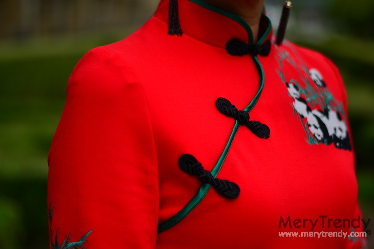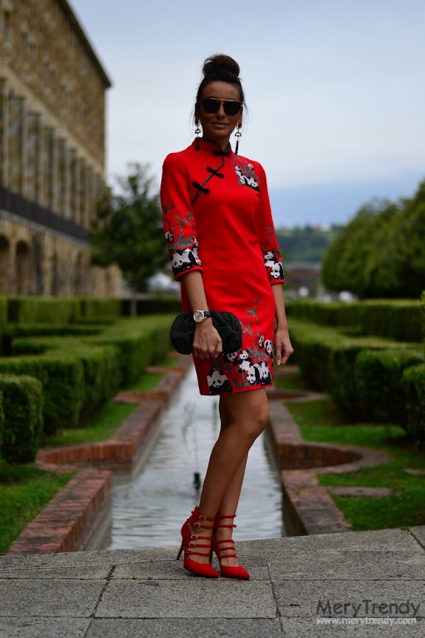 Hoy os enseño un vestido rojo de SammyDress, de corte oriental, con cuello mandarín y manga 3/4, que me encantó, no solo por su corte, sino también por su original estampado con bordado de pandas. Como complemento estrella, unos maxi pendientes geométricos, tan de moda esta temporada, que creo que casan a la perfección con el tipo de prenda. Respecto del peinado, un moño alto, para destacar el cuello y el pendientazo.