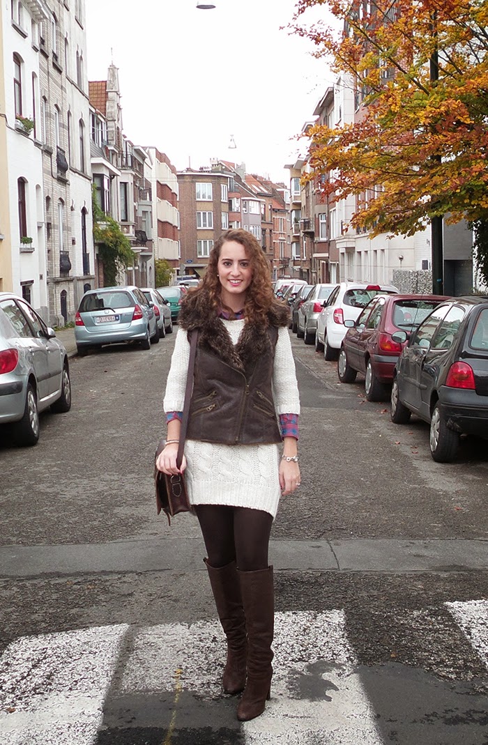 Hola Chic@s! Como va la semana? Hoy os enseño el tipo de look fundamental en invierno; cómodo, abrigado y a la vez estiloso.Como prenda estrella un vestido de lana blanco roto el cual por su color se puede combinar de infinitas maneras, yo en esta ocasión elegí mezclarlo con una camisa de cuadros azules y rojos y complementos en tonos marrones.El chaleco me gusta especialmente por el estilo piloto, las botas y el bolso ya me lo habéis visto en otras ocasiones como aquí o aquí, pero es que últimamente tienen un sitio especial en mi armario.