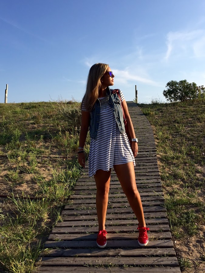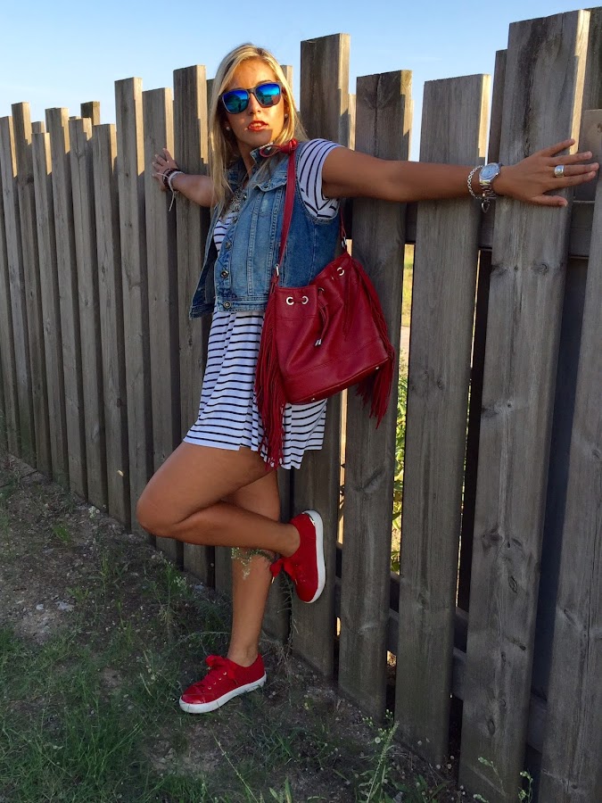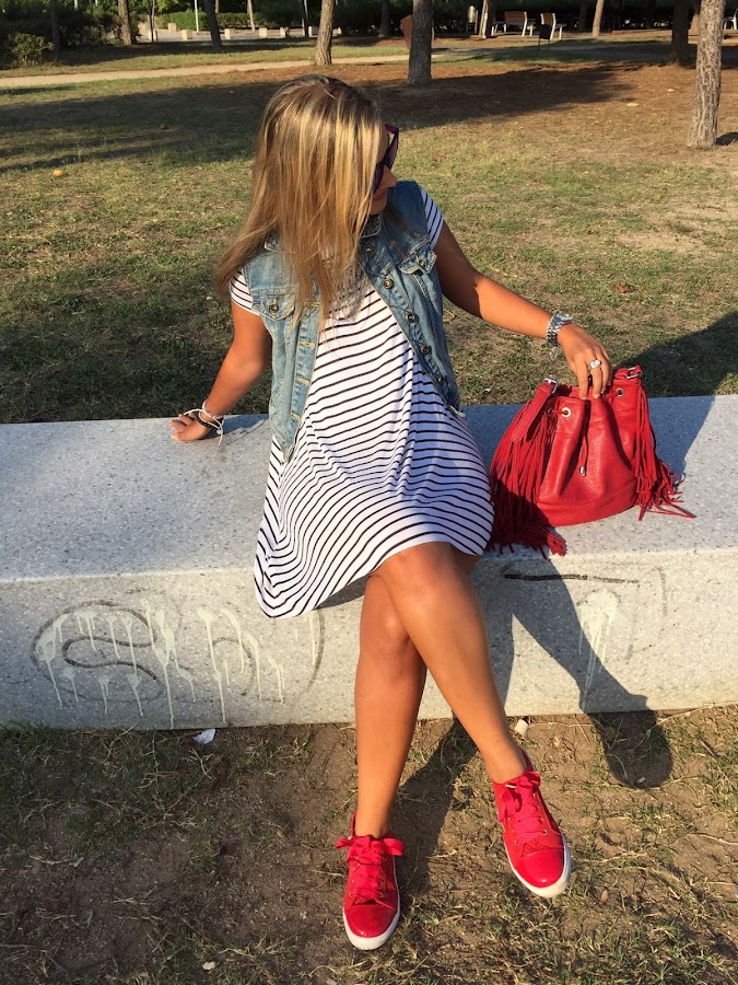 Hoy os enseño un nuevo look con la prenda del mes. Esta vez combiné mi chaleco tejano con un vestido de rayas estilo camiseta. Para darle un toque de color al look me puse unas zapatillas de rojas que compré en rebajas a muy buen precio y mi bolso rojo de flecos. Un look muy casual y cómodo para trotar por la ciudad.