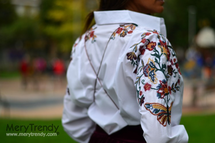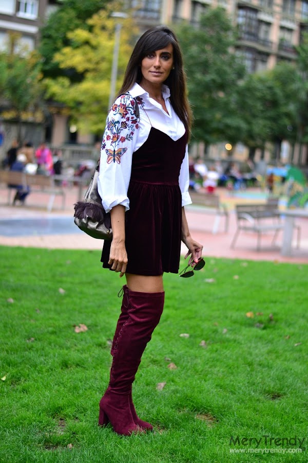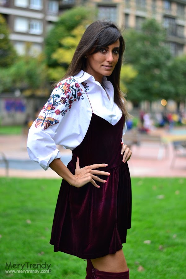 Hoy os enseño el típico mono corto aterciopelado en granate, con escote en pico pronunciado, muy abierto, y tirantes muy finos que van cruzados a la espalda, con la particularidad de que, buscando el efecto "pichi", le he metido debajo una camisa con flores bordadas para darle un aire más casual y no tan "festivo" como el que resultaría si llevase solo el mono y así poder utilizarlo en el día a día en vez de relegarlo solamente a la noche por su tipo de tejido y profundo escote.