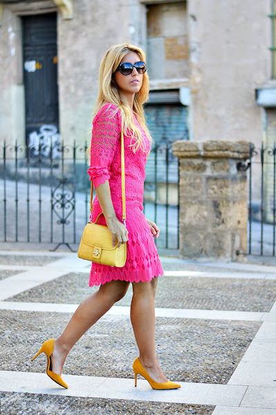 Fuchsia lace dress: Derhy / Heels: Mango / Bag: Zara