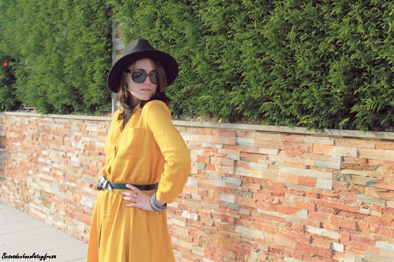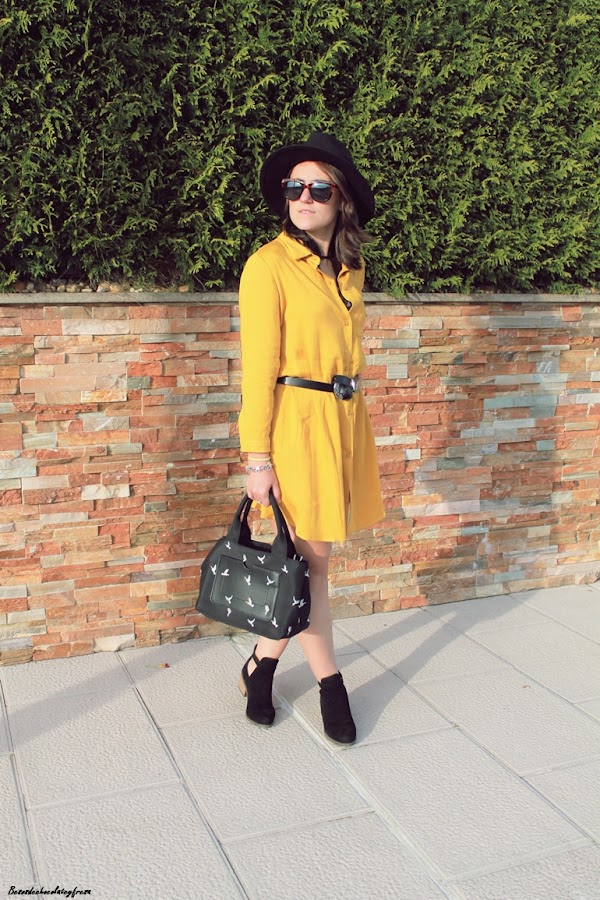 Para esta ocasión, aposté por llevar el vestido en un color que va ser todo una tendencia este otoño, el mostaza, con complementos en negro, desde el cinturón anudado a la cintura, los botines de antelina (pues me encanta esta época en la que combinamos botines con pierna al aire, sin necesidad de medias), bolso, sombrero y bra de encaje. A juego con el color mostaza llevo mi nueva pulsera de abalorios y cuentas, uno de los regalos de mi amigos por mi cumpleaños.
