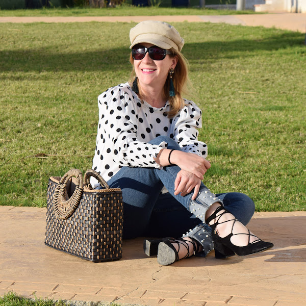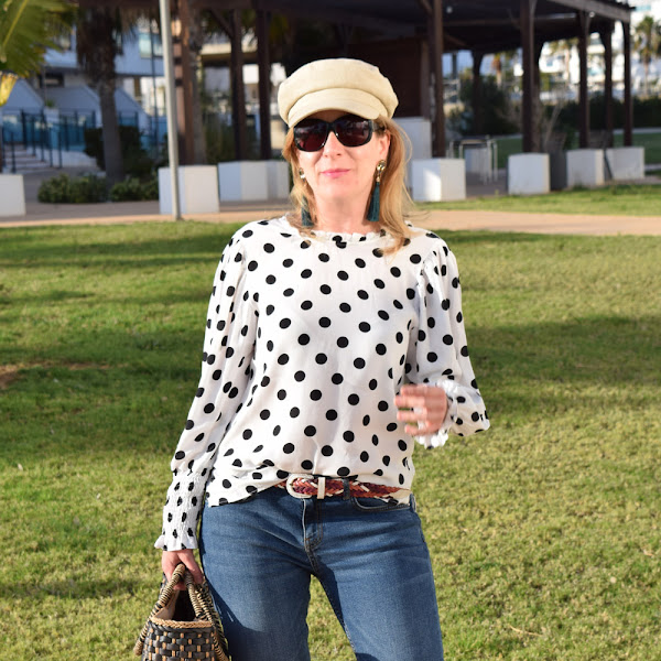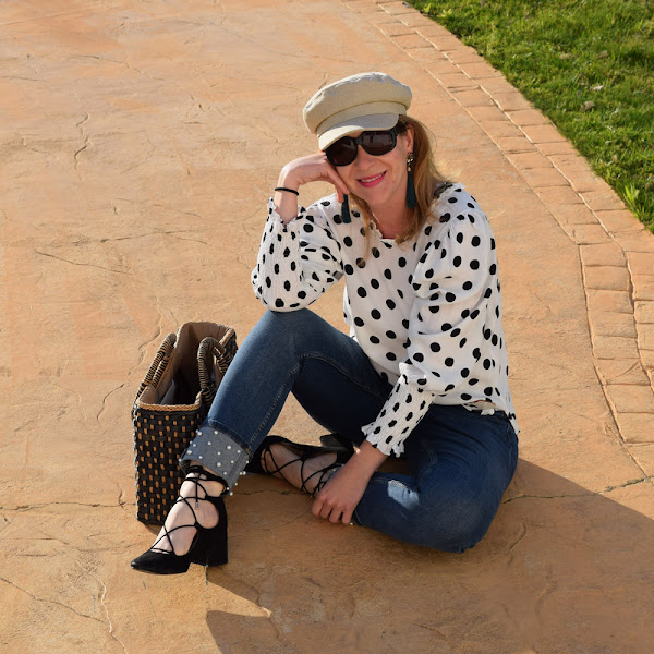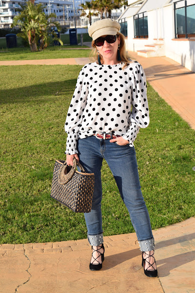 Por eso mismo el look de hoy vuelve a incorporar una gorra beige, de un tejido muy primaveral, para mezclarse con una blusa de lunares y un pantalón con perlas en el bajo.