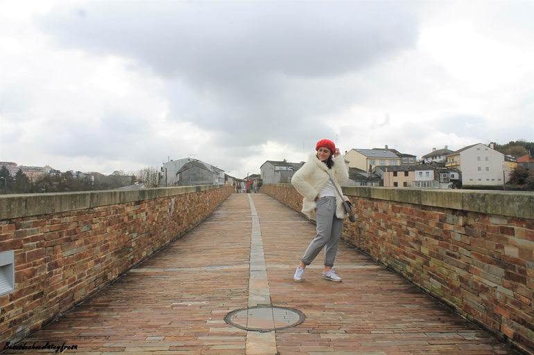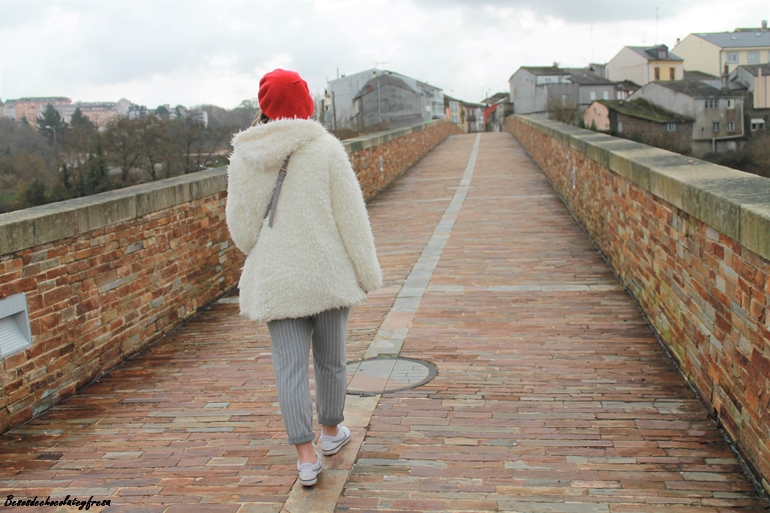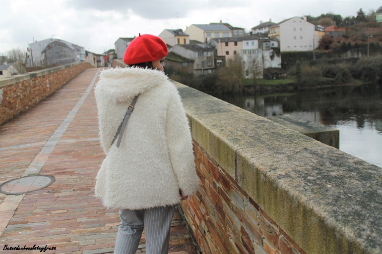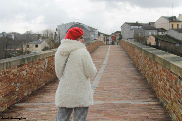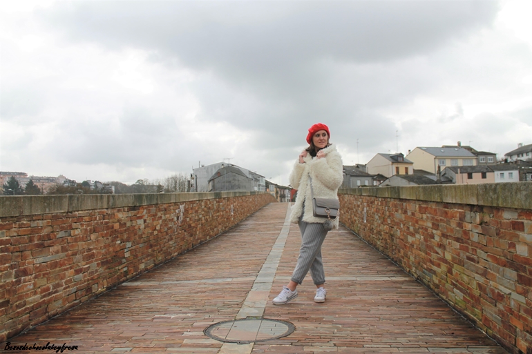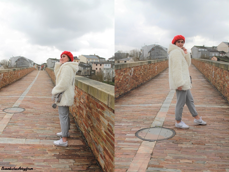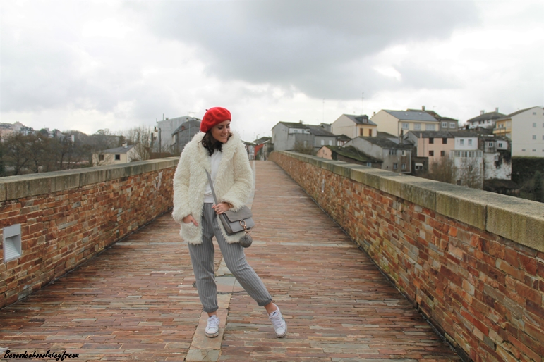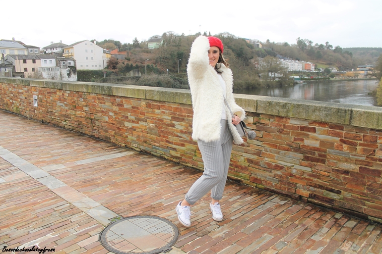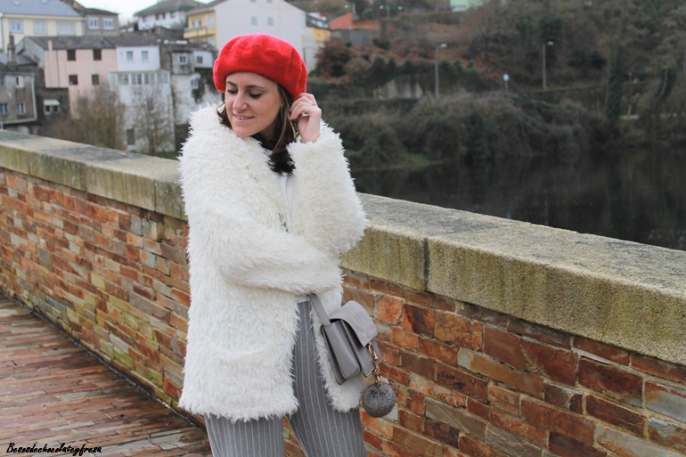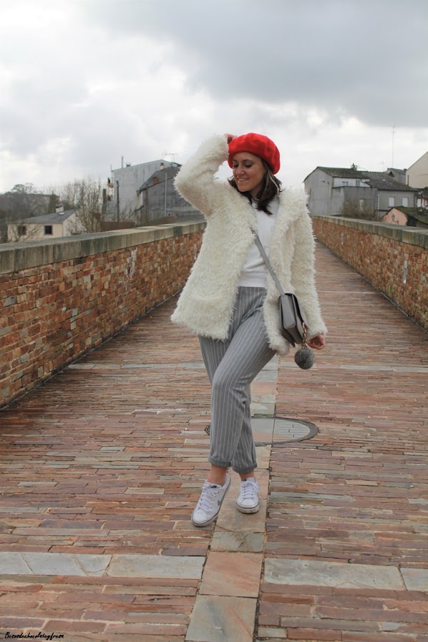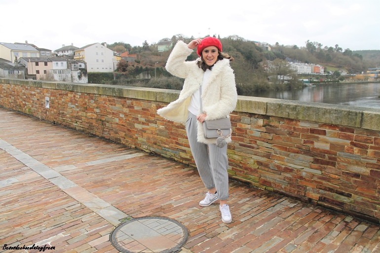 En el outfit de hoy aposte por una gama cromática entre el blanco y el gris, colores muy claros para que todo el color y centro de atención fuese para la boina. Pantalones carrot con raya diplomática en gris clarito y blanco, sudadera y abrigo de peluche en blanco y como complementos bolso tipo Cèline y sneakers.