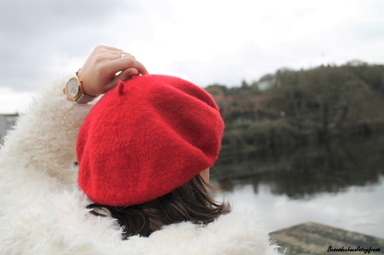 Un rasgo característico de las boinas es ese efecto ladeado cayendo sobre un lado de la cabeza, todo un referente en la moda, femenino cargado de dosis de estilo. Esta que llevo hoy por su color rojo pasión aporta un toque sexy al look y poder de atracción.