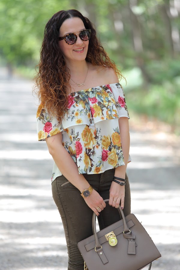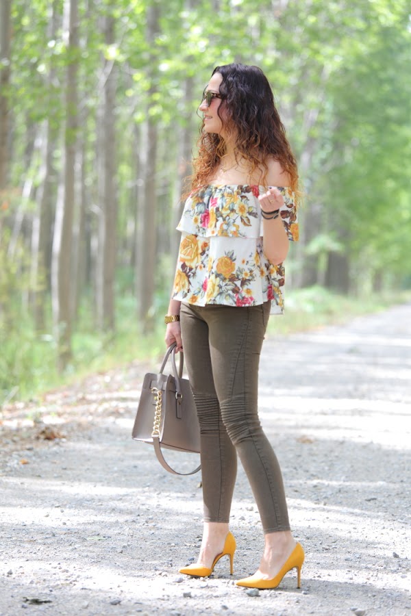 Preparando los posts de esta semana me di cuenta que tenía estas fotos de finales de septiembre pendientes de compartir con vosotros. Así que aprovechando que estos días el tiempo todavía nos está dando una tregua aprovecho para que las veáis. Un outfit sencillo en el que he hecho un combo con un top escote Bardot, que tanto me gusta, y pitillos caqui. El toque lo doy con los salones mostaza que compré el año pasado y que ya tenía ganas de volver a utilizar.