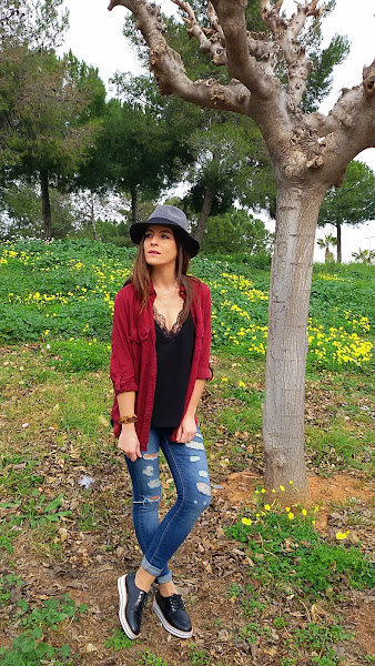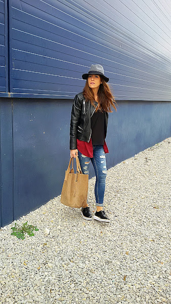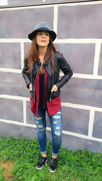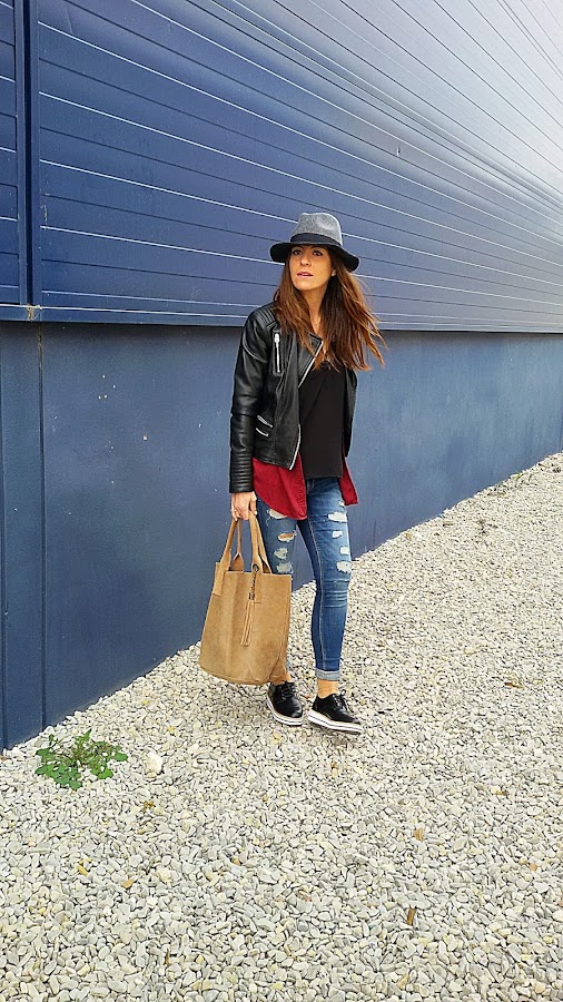 Combiné unos vaqueros muy pitillo con una camisa color burdeos, una camiseta lencera negra para romper con el look y una biker para el fresquito.