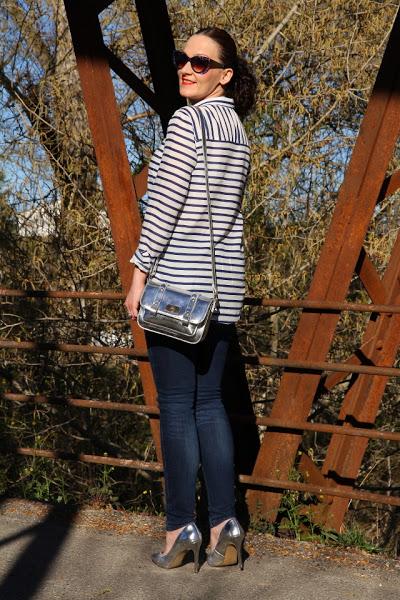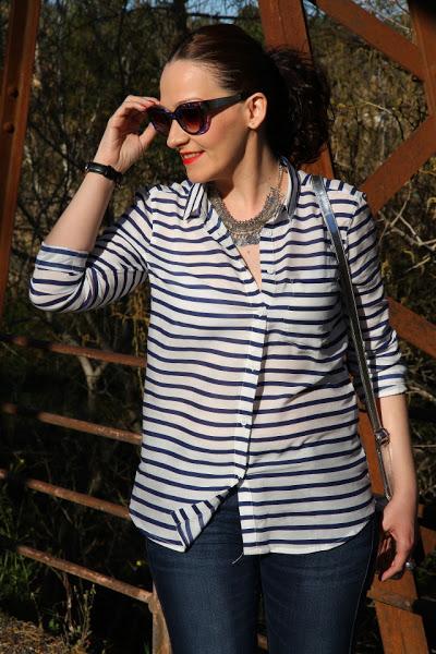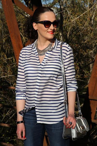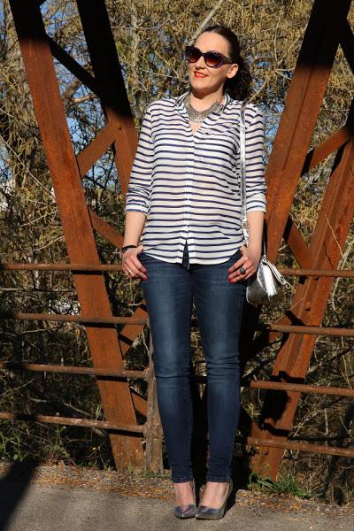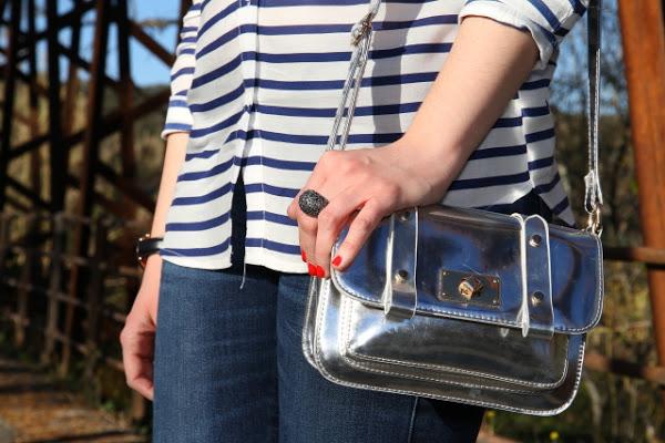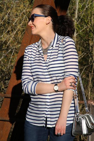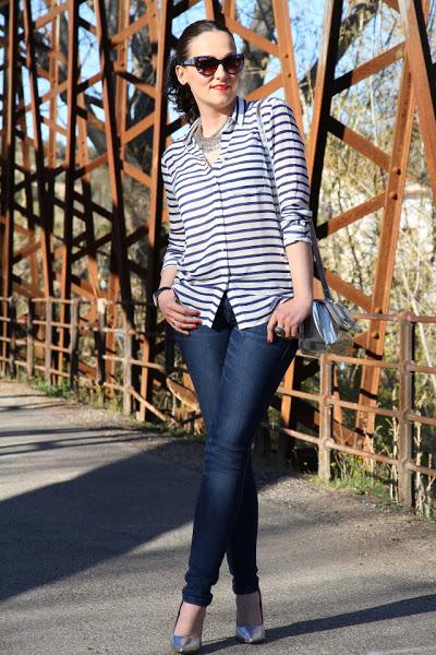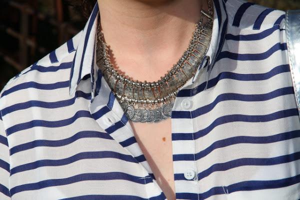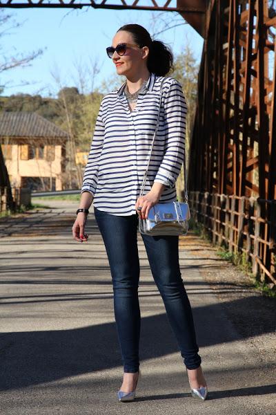 Siempre he pensado que los complementos son una de las partes más importantes de un look. Una elección mal hecha nos lleva muchas veces a encontrarnos con oufits que nos llevan a pensar "si se hubiera puesto otro tipo de zapatos..., o con este bolso habría estado mucho más mona...". Muchas veces me comentáis que siempre llevo los complementos ideales para el look que llevo, la verdad es que me declaro fan absoluta de ellos y siempre paro mucho cuidado cuando los elijo para mis estilismos. Hace unos días os enseñé aquí este mismo look con camisa de rayas y jeans pitillo pero con unos complementos más casuals como son las New Balance y el bolso tamaño XL, hoy en cambio le he dado un toque más chic añadiéndole detalles en plata con el collar étnico, los stilettos y el bolso.