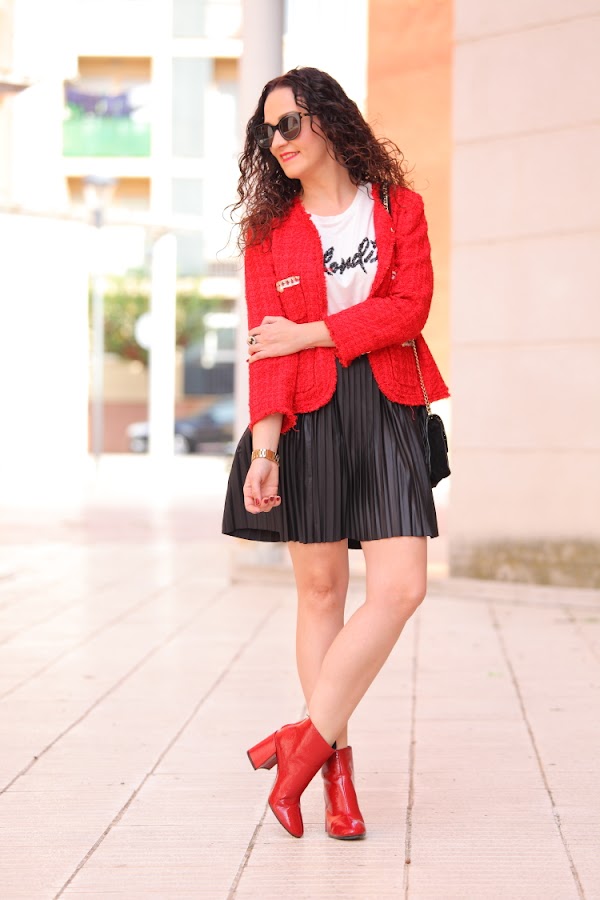 El tweed es un tejido que me chifla para el invierno. Sobre todo me gusta llevarlo en chaquetas ya que te permite crear looks de todo tipo, desde arreglados a más informales. En las rebajas del verano encontré esta chaqueta tiradísima de precio y la guardé hasta que llegó el clima apropiado para lucirla. Las fotos que os enseño hoy son del otoño, cuando amanecían días más cálidos que permitían dejar las medias en casa durante el día, pero no me ha importado publicarlas ahora porque este outfit lo estoy llevando tal cual añadiéndole una buena media. Como veis, he combinado la chaqueta de tweed con una camiseta rockera y falda plisada. Un mix diferente pero que me gusta ¿y a vosotras?.
