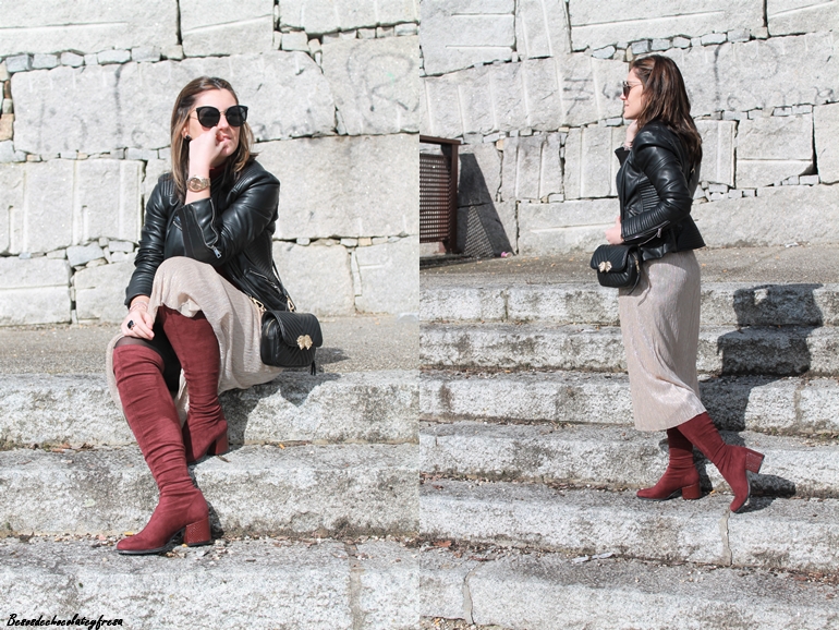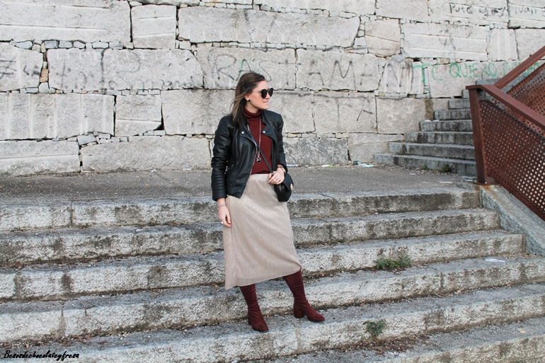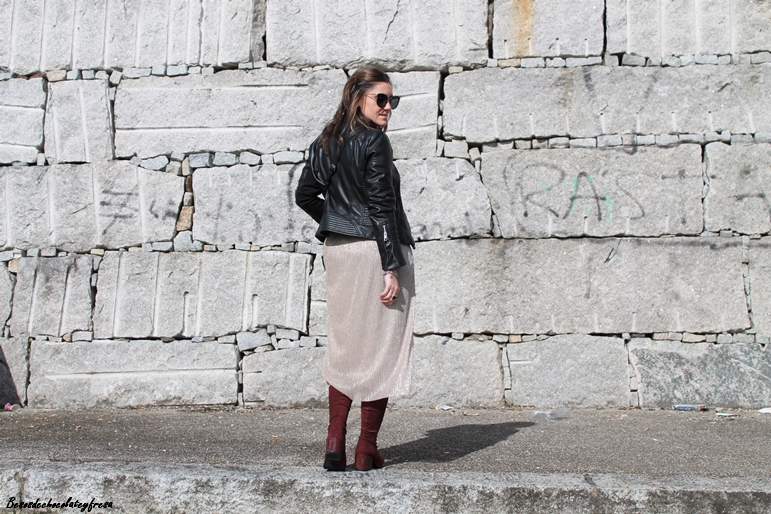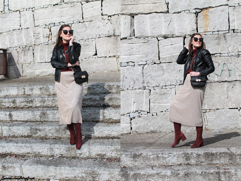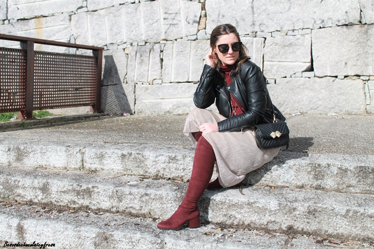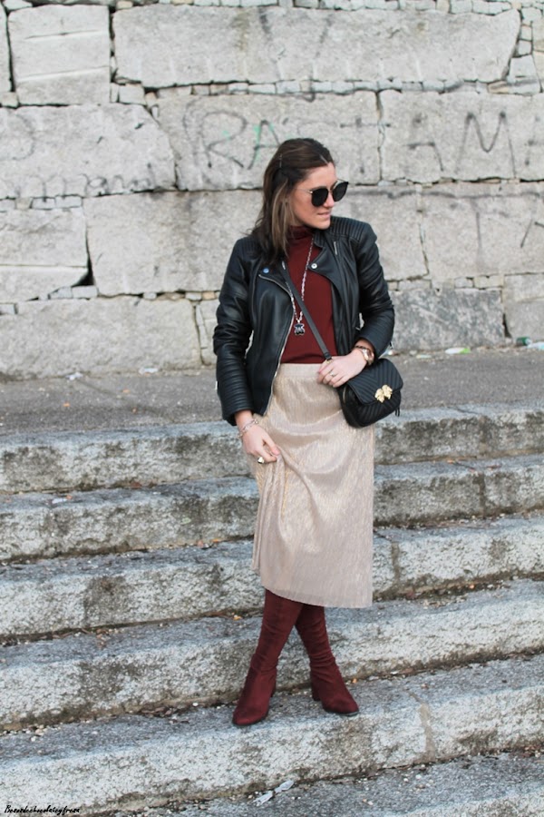 Para el look de hoy aposté por tonos burdeos para combinar la falda midi en dorado, pues los brillos y este color tan destacado no solo es apto para la noche. Sweater de cuello cisne y canalé metida por dentro de la falda a juego con botas XXL de antelina. Como complementos y abrigo aposté por tonos negros como el collar, bolso, gafas de sol y la biker de cuero.