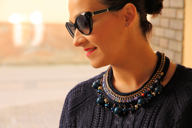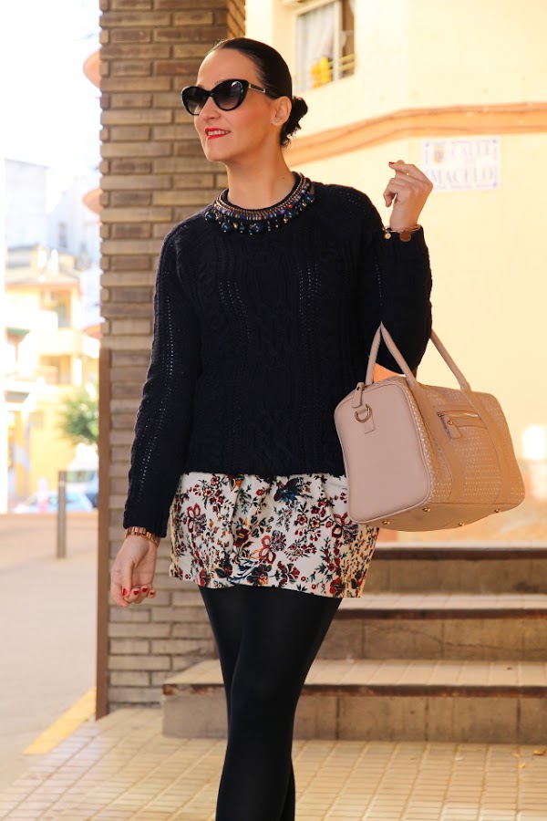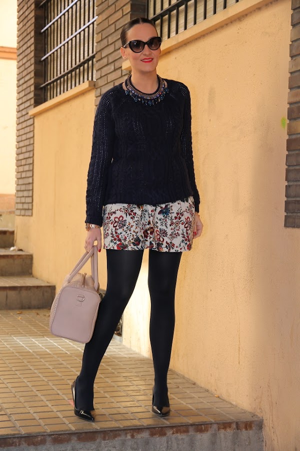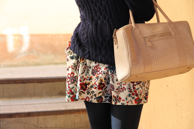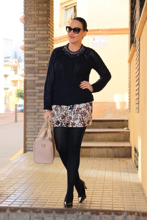 La falda de flores que llevo hoy es de esas prendas que te la compras dudando, la devuelves pero al final terminas volviéndola a comprar porque te arrepientes. Ahora, después de habérmela puesto unas cuantas veces estoy contenta con mi decisión. Con los colores que tiene admite varias combinaciones, hoy por ejemplo la llevo con jersey de punto, collar étnico y zapatos azules pero más adelante os la mostraré con diferentes combos.