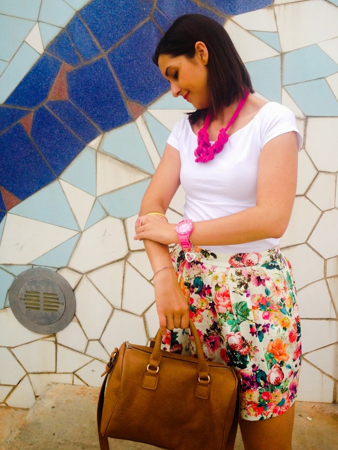 Buenas sweeties! Empezamos nueva semana, y hoy os traigo un look con falda, ya que hace tiempo que no os enseñaba ninguno. Esta falda de estampado floral la combiné con una camiseta blanca, para darle todo el protagonismo a la falda. Me la puse con mis sandalias coral y mi nuevo bolso de Stradivarius. Un look sencillo, pero muy chic.